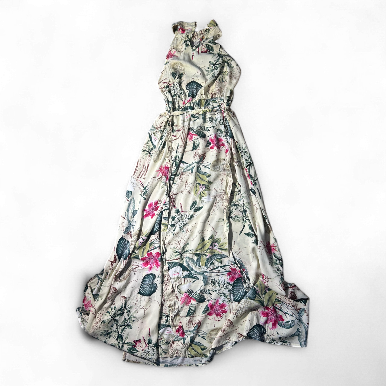 Luftiges Sommer-Maxikleid von SHEIN mit zartem Blumenprint auf hellem Grund. Das Kleid hat einen hohen Ausschnitt mit Schleife zum Binden, einen elastischen Taillenbund und ist bodenlang geschnitten. Perfekt für Urlaub, Gartenpartys oder sommerliche Spaziergänge. Die Brustweite beträgt 44 cm, die Länge ca. 126 cm. Der Zustand ist excellent. 🕊️