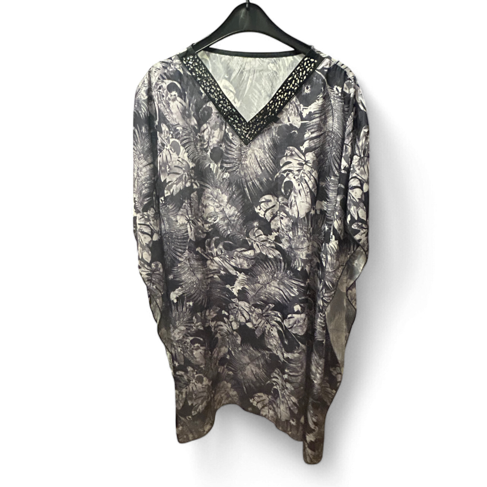 Diese luftig-leichte Tunika von Paradisio in Größe S/M ist ein echtes Highlight für Frühling und Sommer ☀️ Der lockere Schnitt sorgt für eine bequeme Passform mit einer Breite von 90 cm und einer Länge von 98 cm. Besonders auffällig ist der mit kleinen Glitzersteinen verzierte V-Ausschnitt ✨ Das florale Muster in Grau-Schwarz wirkt edel und dennoch leger – perfekt für Strand, Urlaub oder Stadtbummel 👜