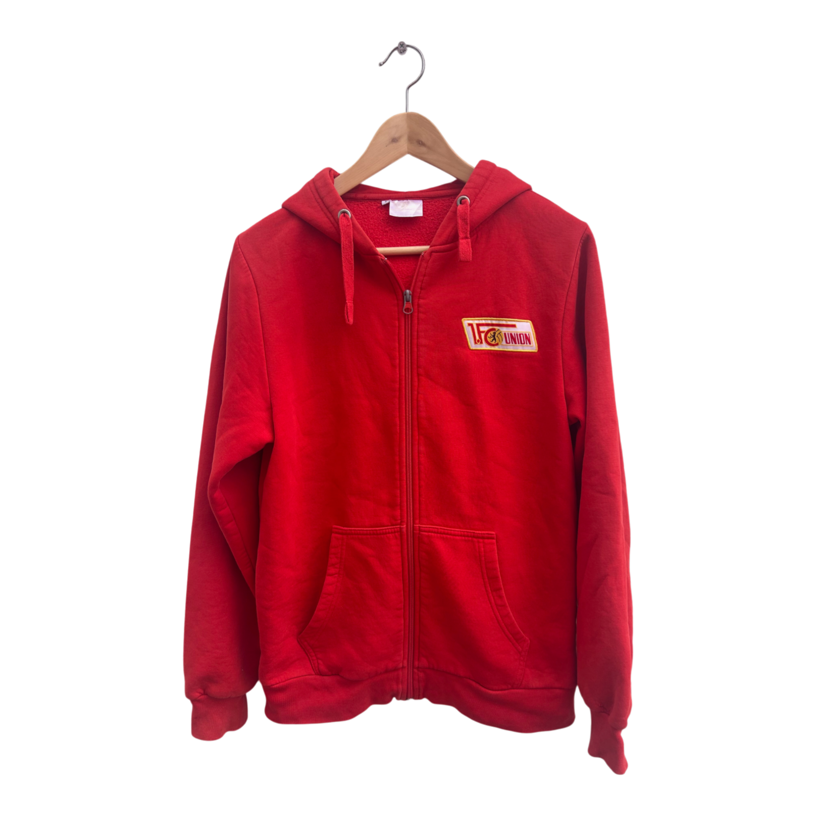 Der Hoodie in Größe S (Brustweite ca. 53 cm, Länge ca. 65 cm) besteht aus 80 % Baumwolle und 20 % Polyester. Er zeigt leichte Gebrauchsspuren, ist aber insgesamt in gutem Zustand – ein echtes Must-Have für jeden Union-Fan. 🔴⚪
