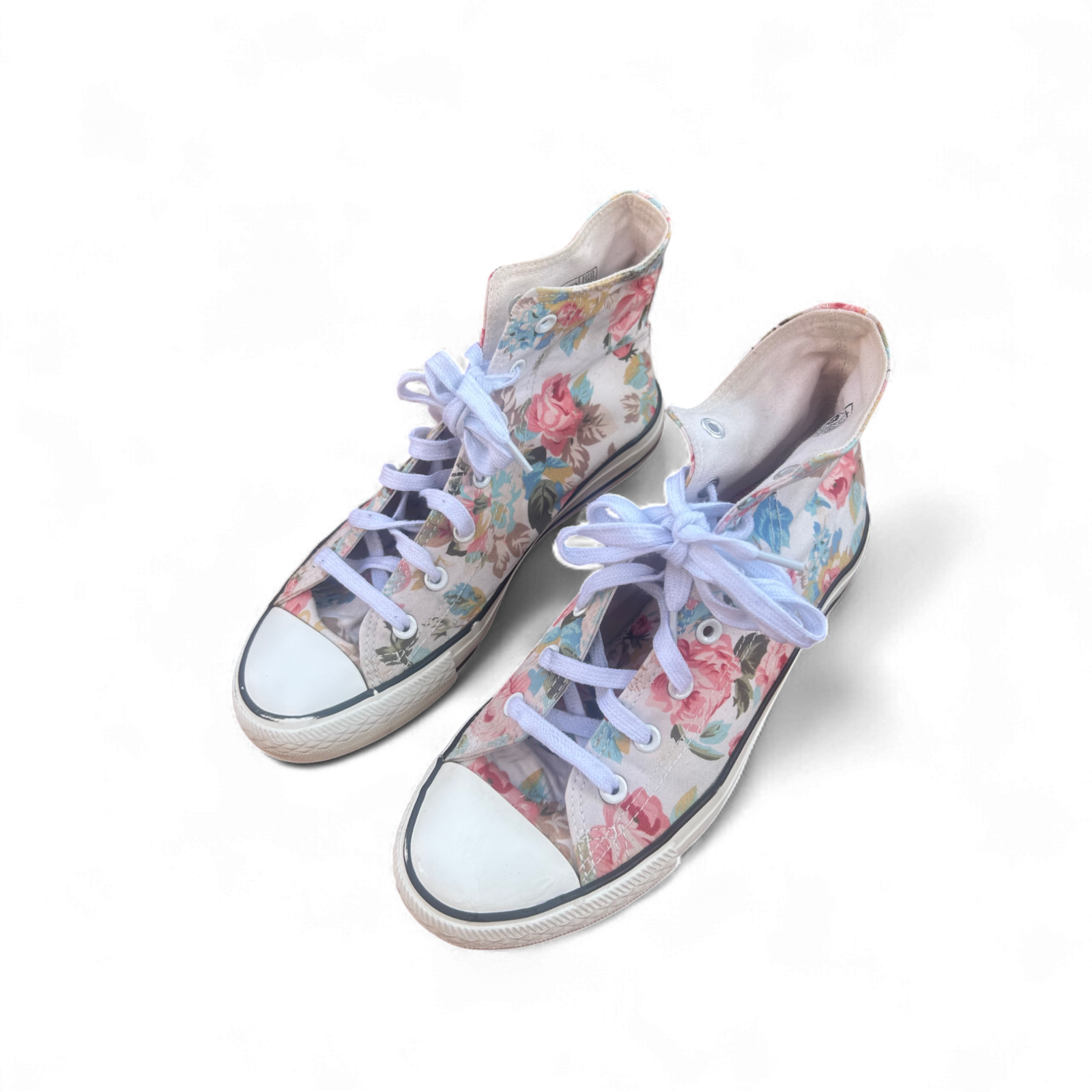 🌸 Süße High-Top-Sneaker der Marke 1994 in Größe 38 mit floralen Print. Der leichte Stoff und die flexible Gummisohle machen sie zu einem idealen Begleiter für Frühling und Sommer. Die Schuhe wurden getragen und weisen außen dezente Gebrauchsspuren auf, sind aber insgesamt in gutem Zustand und bereit für viele weitere Einsätze. Ein echter Hingucker für alle, die verspielte Looks lieben! 💐👟