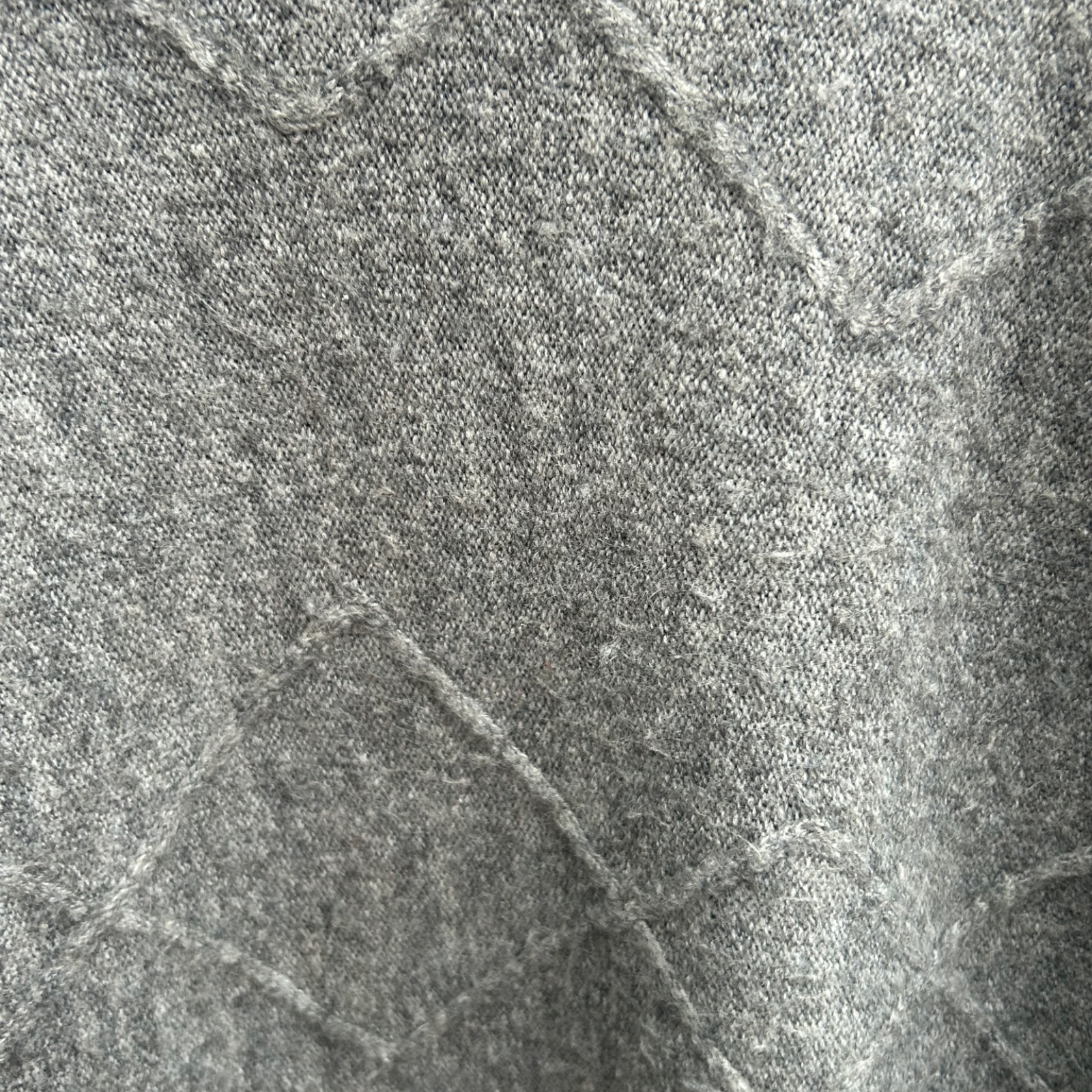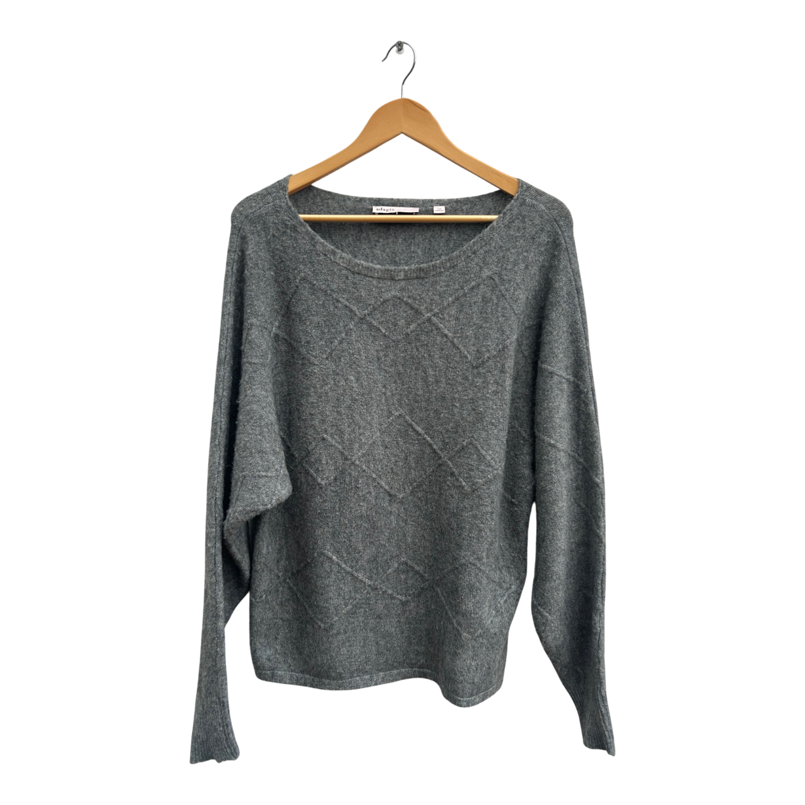 Eleganter grauer Pullover von Adagio in Größe 40 mit weichem Griff und feinem Strukturmuster in Rautenoptik. Das Material ist nicht ausgezeichnet, wurde aber nach Griff und Dehnbarkeit als Kaschmir-Woll-Mischung mit Stretchanteil eingeordnet. Der Pullover fällt locker, hat moderne Fledermausärmel und einen weiten Rundhalsausschnitt – ideal für einen stilvollen Casual-Look.