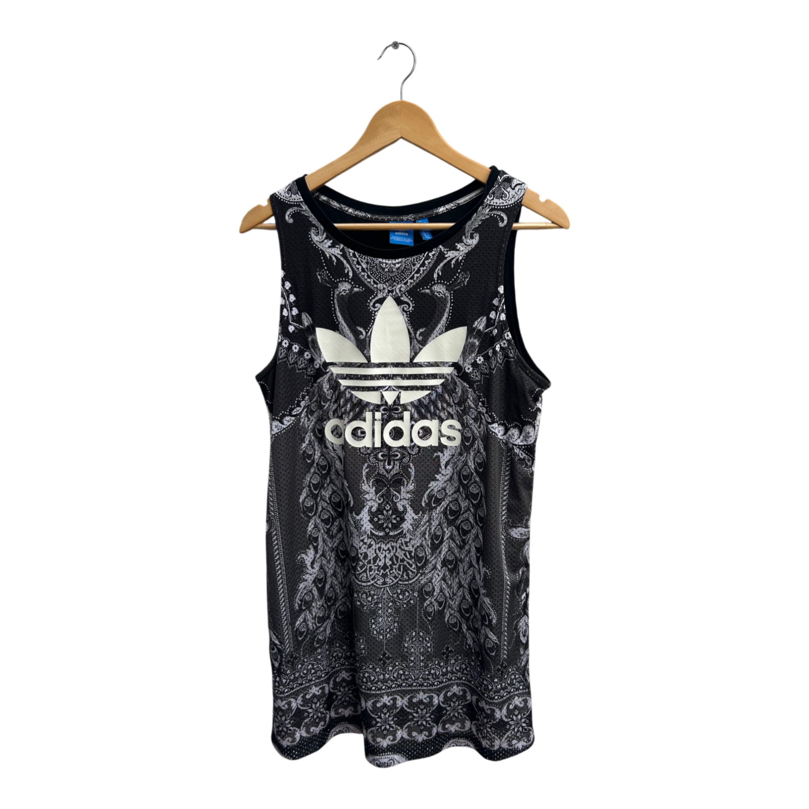 Es hat einen figurumspielenden Schnitt, ein großflächiges Muster im Paisley-Stil und das ikonische adidas Trefoil Logo auf der Vorderseite. Brustweite ca. 49 cm, Länge ca. 84 cm. Der Zustand ist ausgezeichnet – ideal für sportliche Freizeitlooks oder Festival-Outfits 🎧.