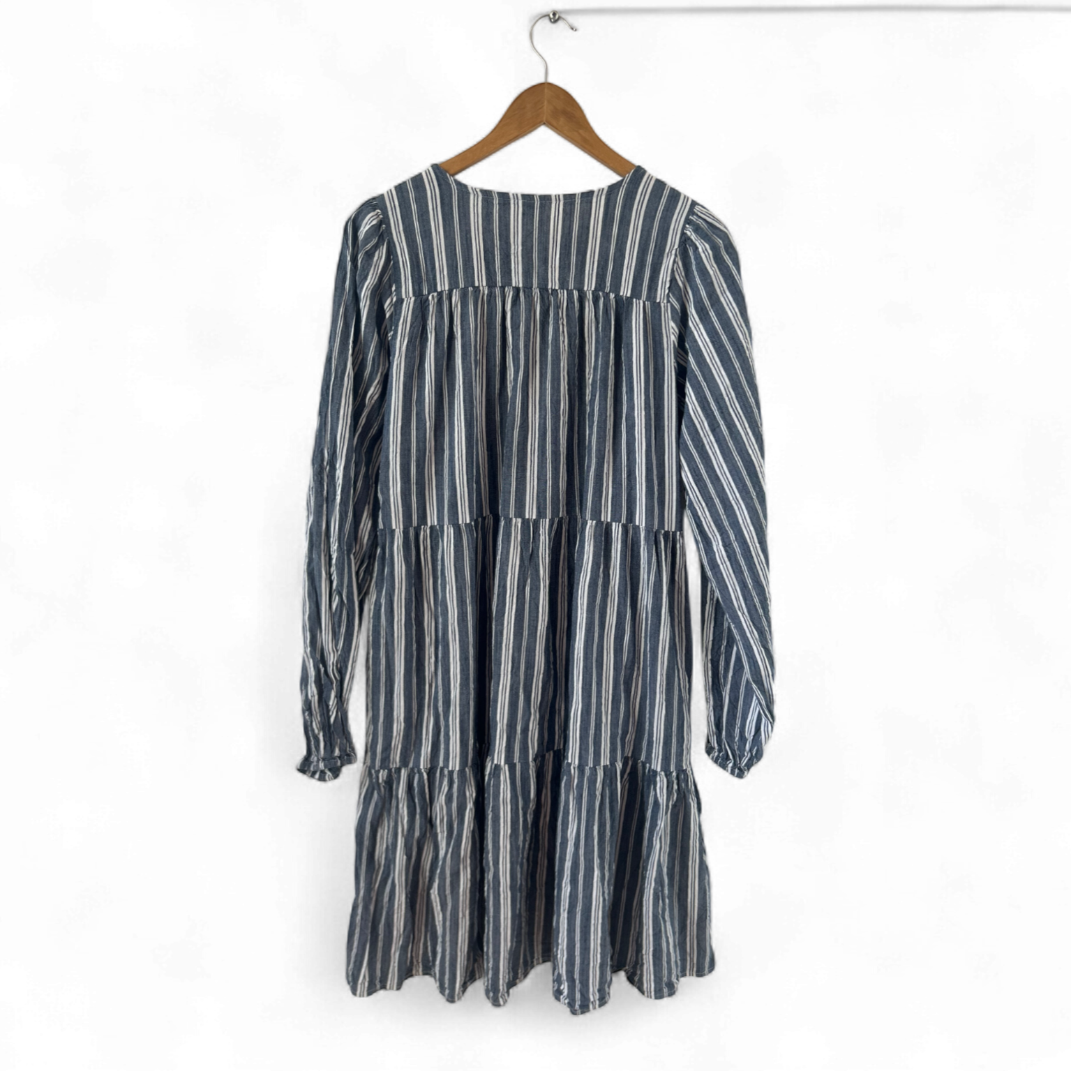Leichtes Boho-Kleid von Old Navy in Blau-Weiß mit luftiger Tunika-Silhouette und dekorativen Stufen 🌾. Der lockere Schnitt, das Streifenmuster, lange Ärmel mit Gummizug und der V-Ausschnitt mit Bindeband machen es perfekt für warme Tage, Urlaub oder Festival-Looks. Brustweite ca. 50 cm, Länge ca. 100 cm. Sehr guter Zustand. Aus weichem Baumwoll-Viskose-Mix.
