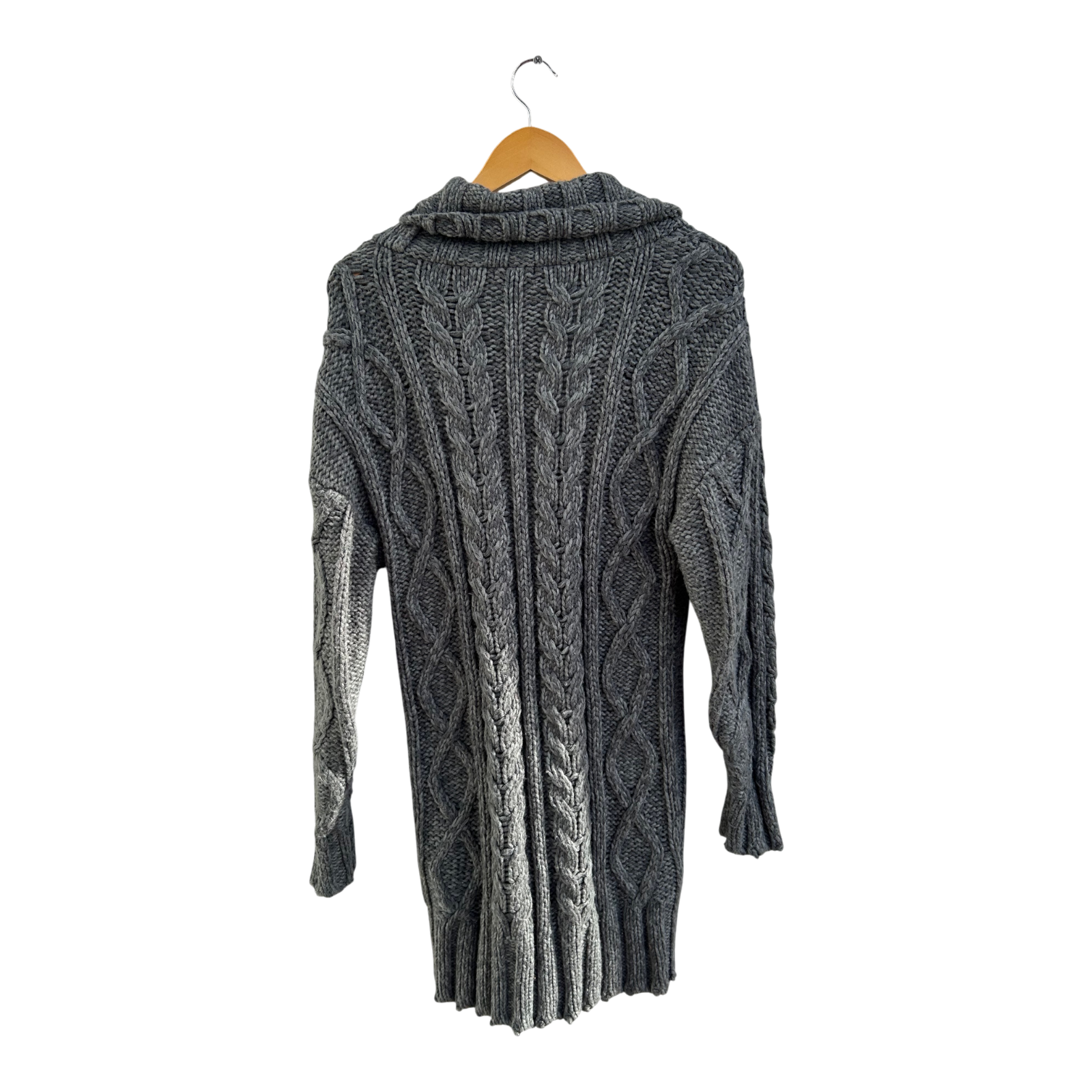 Die schwere, hochwertige Grobstrickqualität mit klassischem Zopfmuster sorgt für Wärme und Stil zugleich. Der Mantel hat einen breiten Schalkragen, große Knöpfe vorn und zwei aufgesetzte Taschen. Er fällt locker und reicht bis über die Hüfte – ideal für kühle Tage und perfekt kombinierbar zu Jeans oder Kleid.