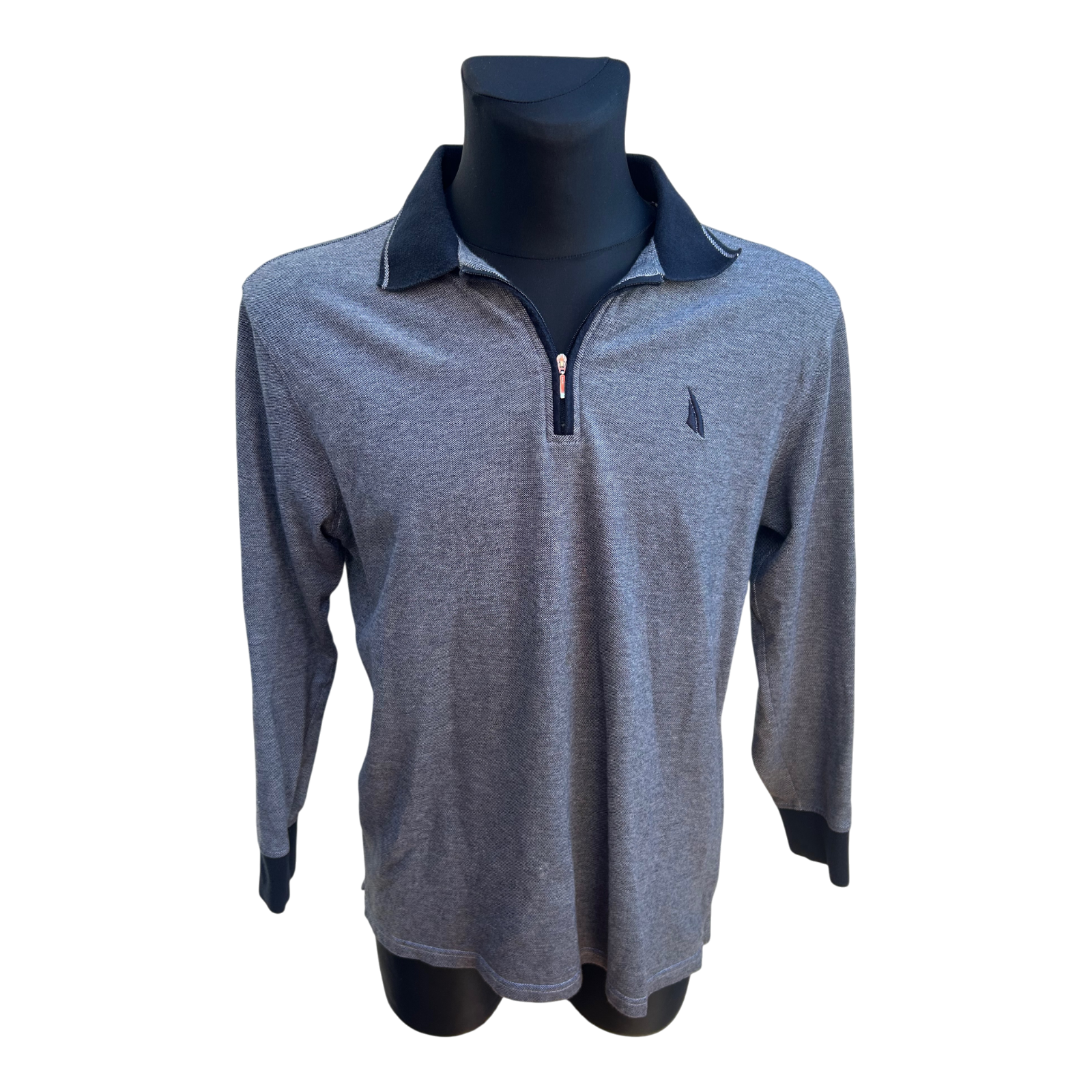 Klassisches Langarm-Poloshirt von Andrew James Sailing in Grau. Das Modell überzeugt durch seinen sportlich-eleganten Stil mit halbem Reißverschluss und kontrastierendem Kragen in Dunkelblau. Es besteht aus 100 % Baumwolle und bietet angenehmen Tragekomfort. Die Brustweite beträgt 58 cm, die Länge 72 cm und die Ärmellänge 64 cm. Ideal für Freizeit, Segeltörn oder den legeren Bürolook ⚓️. Das Shirt befindet sich in sehr gutem Zustand und ist hochwertig verarbeitet.