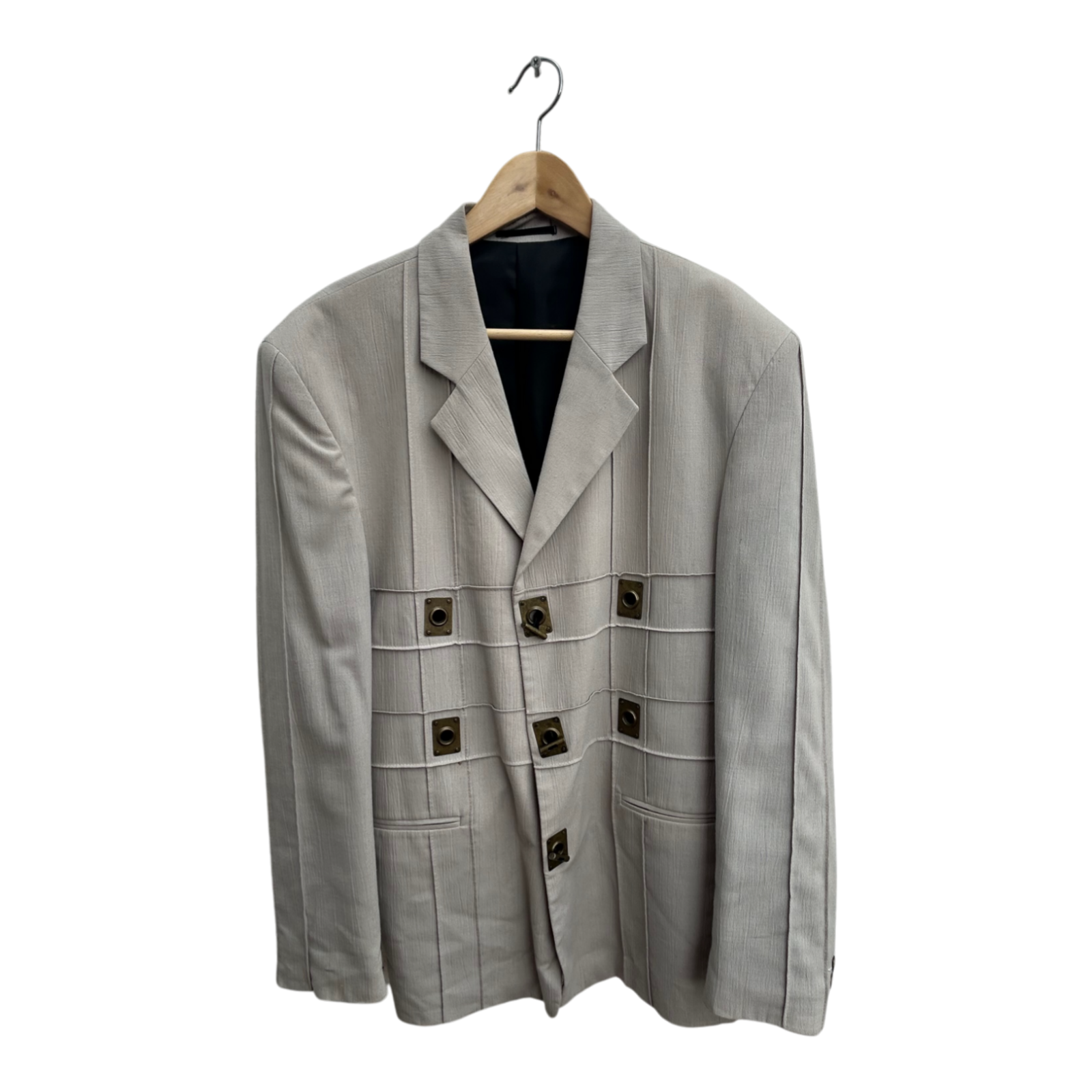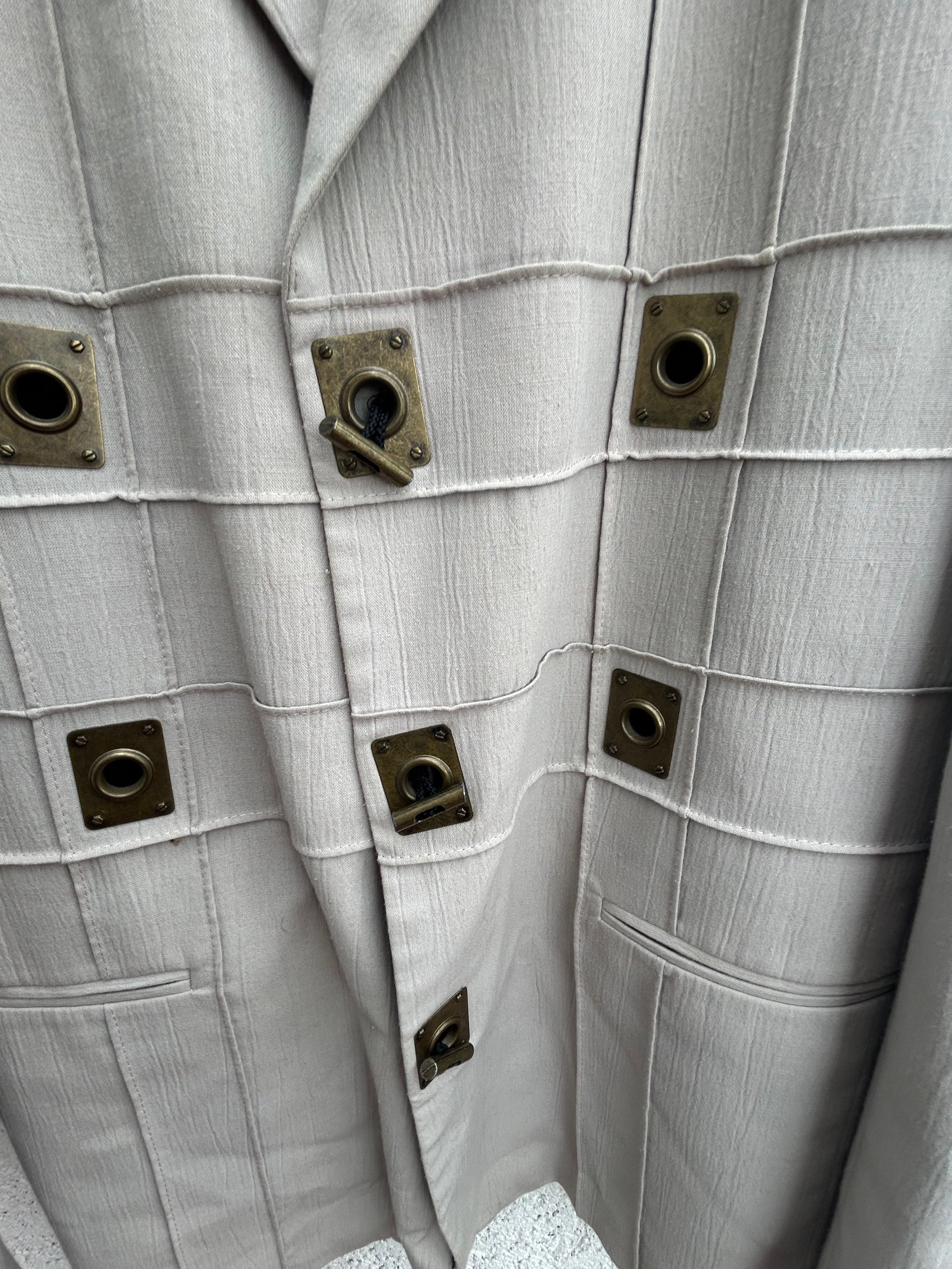 Extravagantes Designer-Sakko von Antonio Archini in Größe 54 – ein echter Hingucker mit außergewöhnlichem Verschlussdesign aus bronzefarbenen Ösen und Knebelriegel. Die Jacke besticht durch ihren strukturierten Stoff, das markante Streifenmuster und eine klare, kantige Silhouette. Innen ist sie mit einem hochwertigen Futter aus 50 % Viskose und 50 % Polyester ausgestattet. Trotz einer leichten Staubschicht vom Lagern ist das Stück in sehr gutem Zustand und wirkt ungetragen. Ideal für modebewusste Herren, die Stil mit einem Hauch Avantgarde verbinden wollen. 🎯