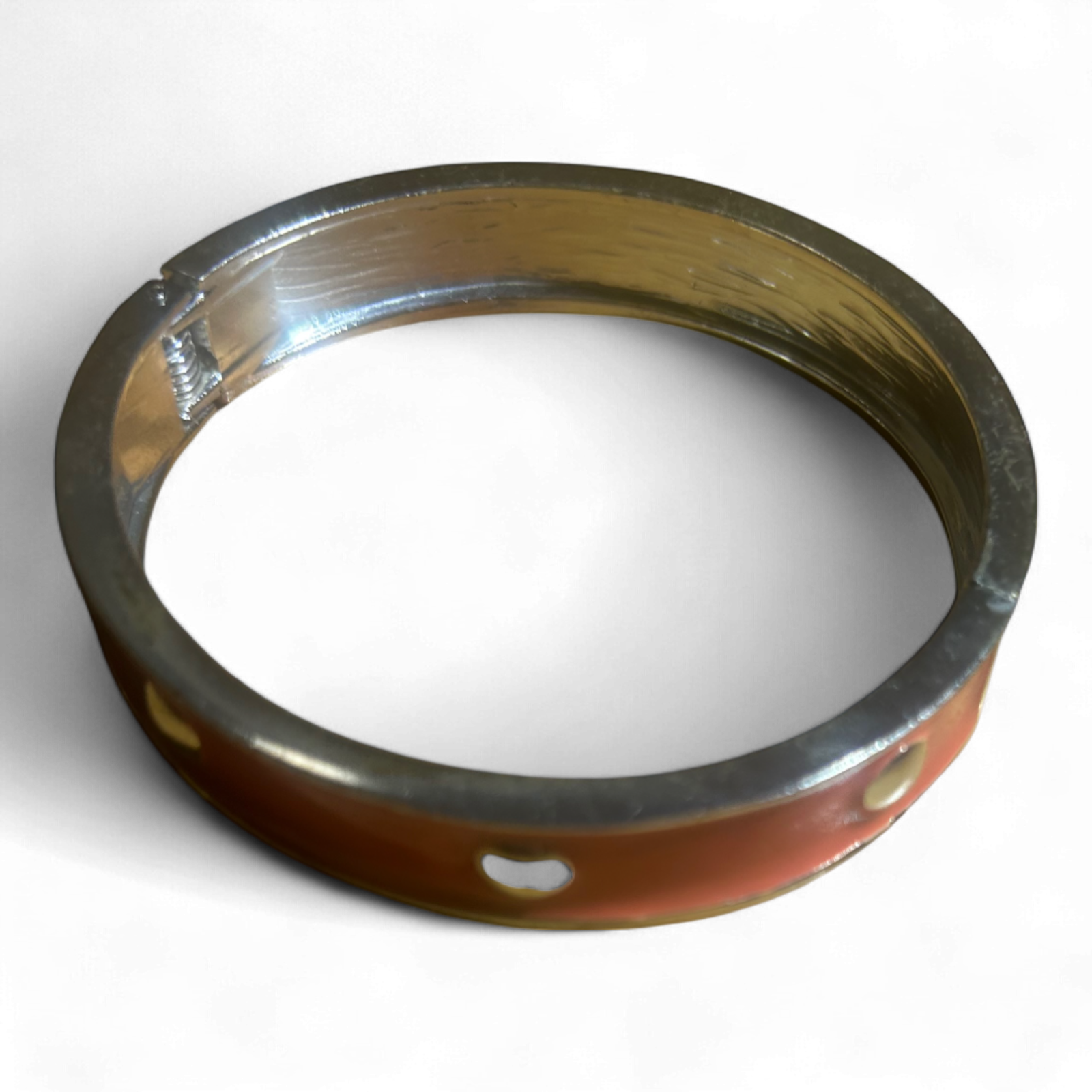 🧡 Moderner Armreif mit glänzender oranger Oberfläche und silberfarbenen Nieten-Details! Der Reif besteht aus stabilem Metall mit farbiger Kunststoffbeschichtung und hat eine feste, ovale Form mit Klappverschluss. Mit einem Umfang von ca. 21 cm und einer Breite von 1 cm passt er bequem ans Handgelenk und verleiht jedem Outfit einen stilvollen Farbakzent. Ideal als modisches Accessoire für Alltag oder Party. ✨