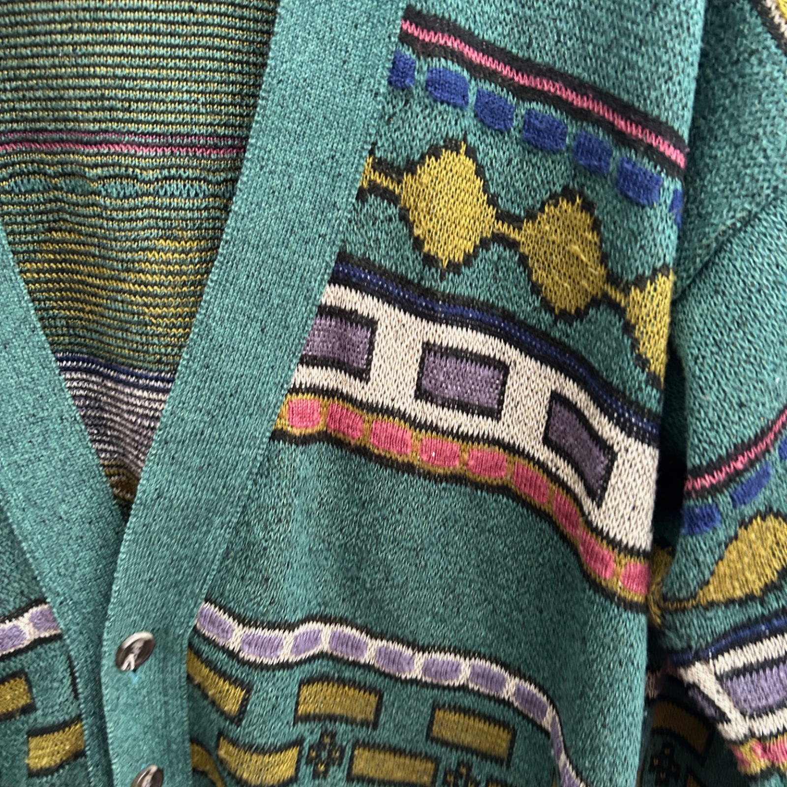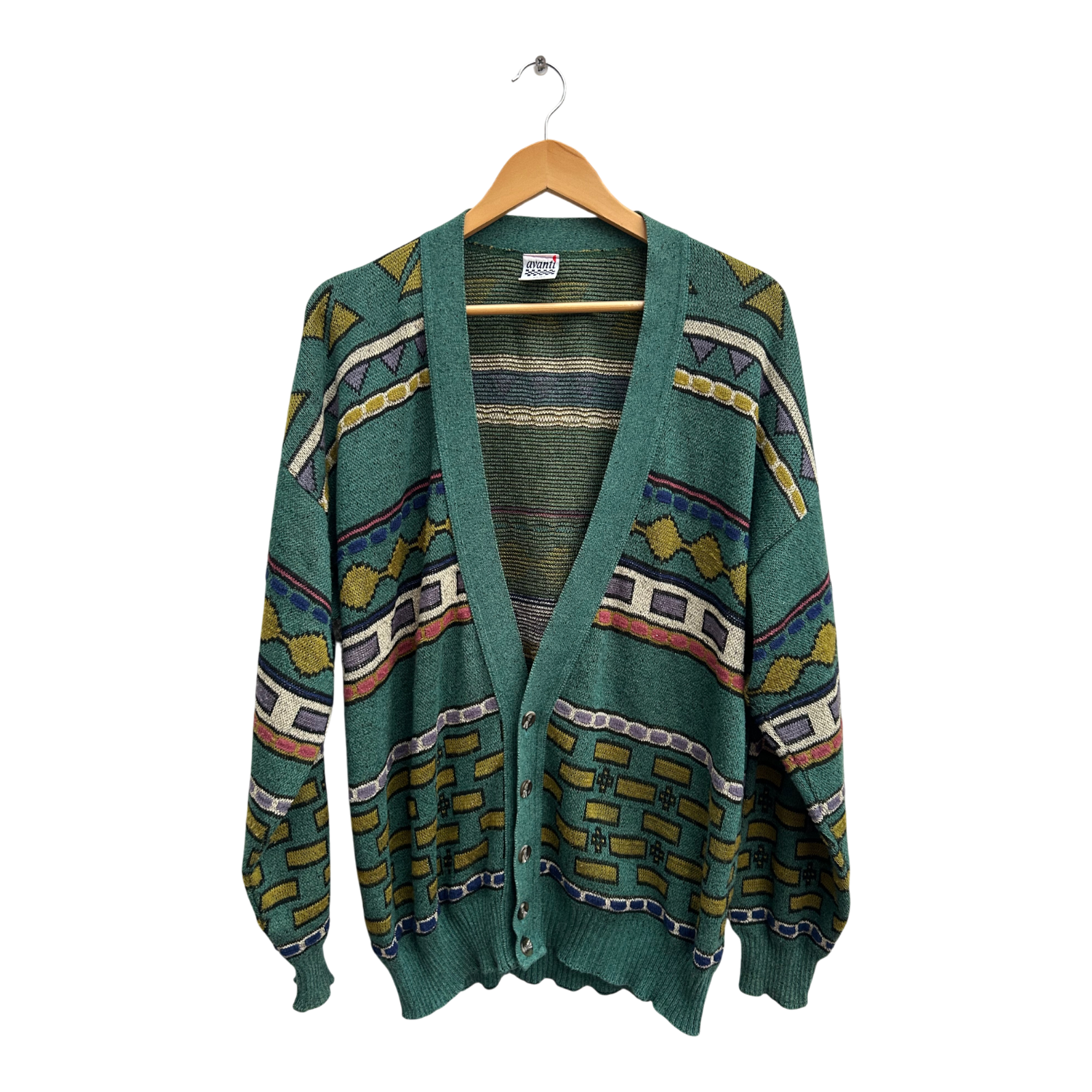 Avanti Strickjacke Herren Gr 52 L Grün Bunt Vintage 80er Retro Muster Baumwolle Mix