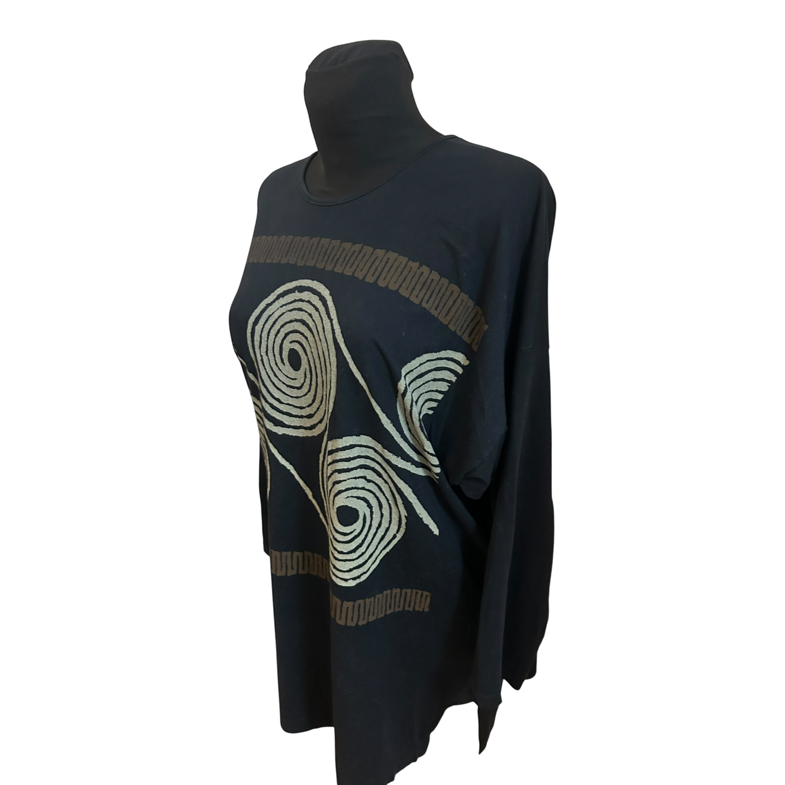 Außergewöhnliches Shirt von Beldona in Größe M in tiefem Schwarz mit markantem grafischem Muster 🖤 Der Schnitt ist bewusst sehr weit und locker gearbeitet und wirkt modern und lässig.