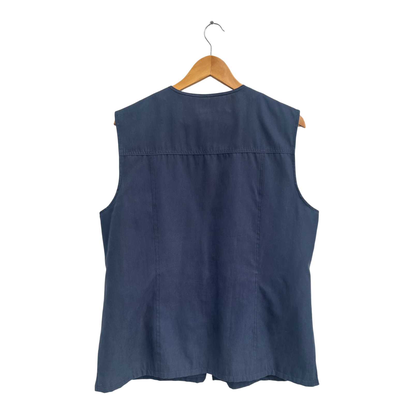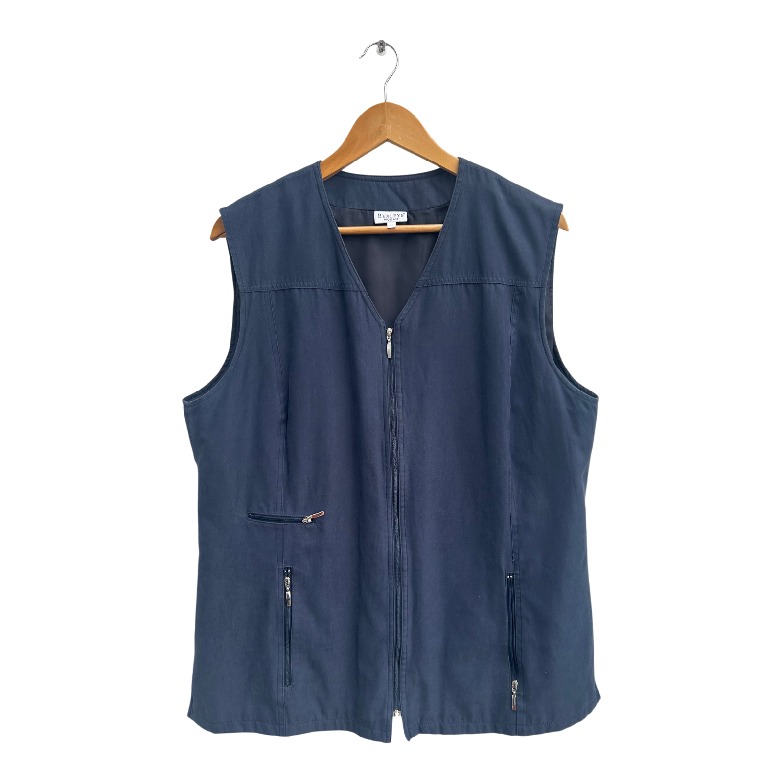 Leichte Damenweste von Bexleys Woman in Größe 44. Die Weste ist in einem edlen Dunkelblau gehalten und aus 100 % Polyester gefertigt – angenehm leicht, pflegeleicht und perfekt für Übergangszeiten. Sie wird mit einem durchgehenden Reißverschluss geschlossen und hat drei praktische Reißverschlusstaschen auf der Vorderseite.