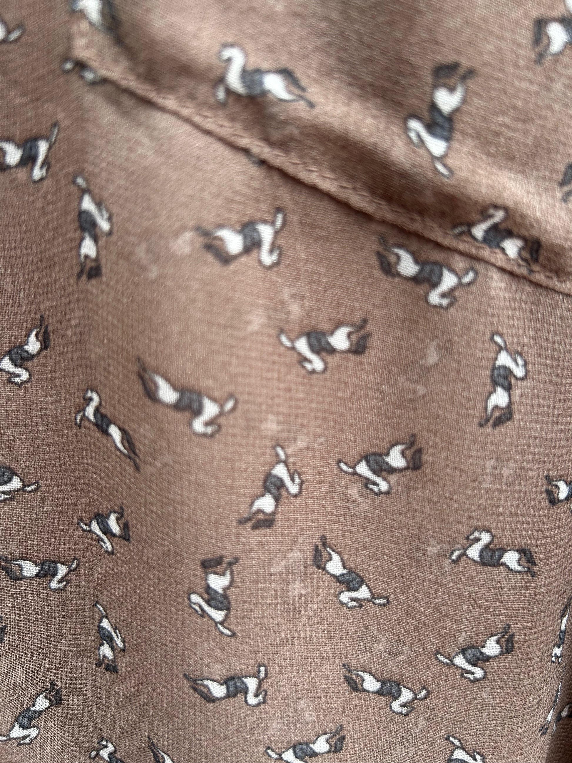Zarte und transparente Bluse von Blue Bird in Größe L mit verspieltem kleinen Pferdemuster. Brustweite 52 cm, Länge vorne 65 cm, hinten 75 cm, Ärmellänge 65 cm. Das Material besteht aus 100 % Polyester, angenehm leicht und fließend. Mit Krempelärmeln, aufgesetzten Brusttaschen und leicht verlängertem Rückensaum. Die Bluse fällt locker und schmeichelt der Figur, ideal für Büro, Freizeit oder als besonderer Akzent im Alltag.