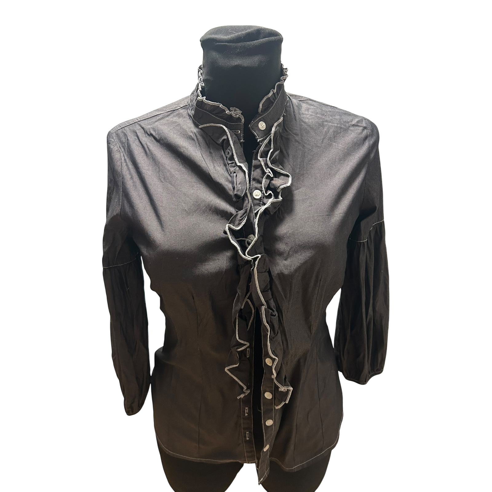 Wunderschöne braune Bluse in der Größe XS mit femininen Rüschen entlang der Knopfleiste und am Stehkragen 🤎 Die Bluse ist leicht stretchig und schmiegt sich angenehm an. Der Dreiviertelarm ist leicht puffig gearbeitet und misst ca. 48 cm.