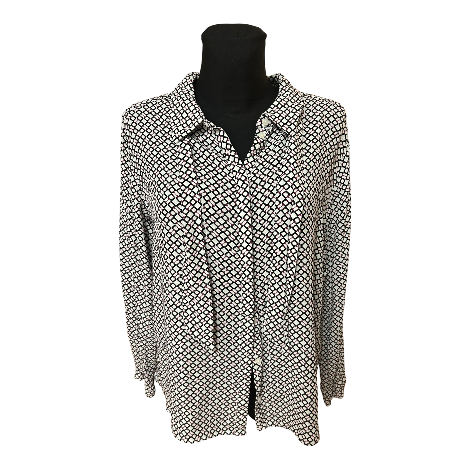 Sehr stilvolle Bluse von Bonita in Größe 42 🤍 Die Bluse ist weiß mit schwarzem und violettem Muster und wirkt dadurch modern, aber dennoch klassisch. Der Stoff aus 100% Polyester fällt weich und leicht fließend, was der Bluse eine elegante Ausstrahlung verleiht.