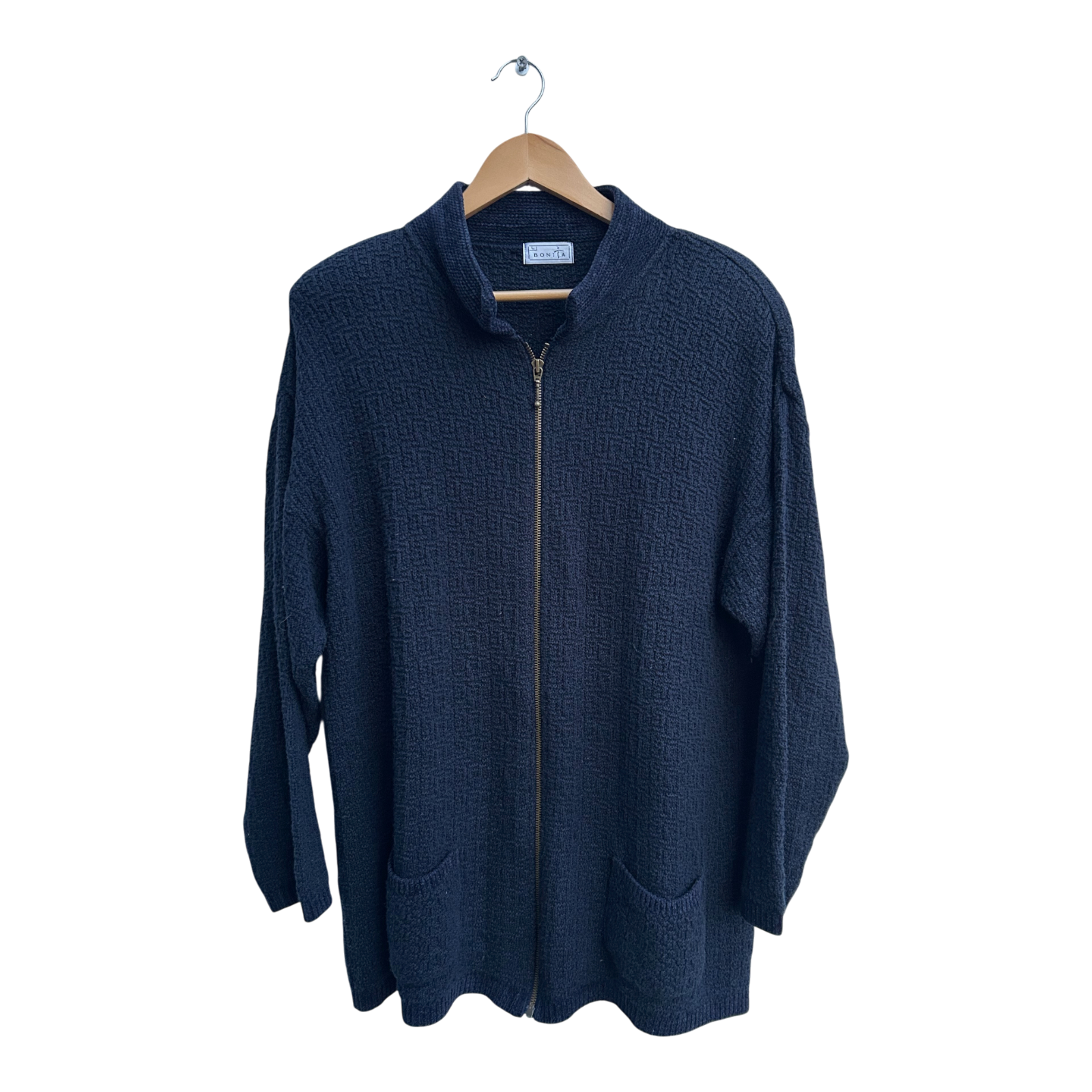 Klassische Strickjacke von Bonita in Größe L, gefertigt aus einem hochwertigen Baumwoll-Acryl-Mix. Die Jacke hat eine strukturierte Oberfläche, zwei aufgesetzte Taschen und einen durchgehenden Reißverschluss. Schulterpolster sorgen für eine formstabile Silhouette, während der leicht kastige Schnitt bequem und elegant wirkt.