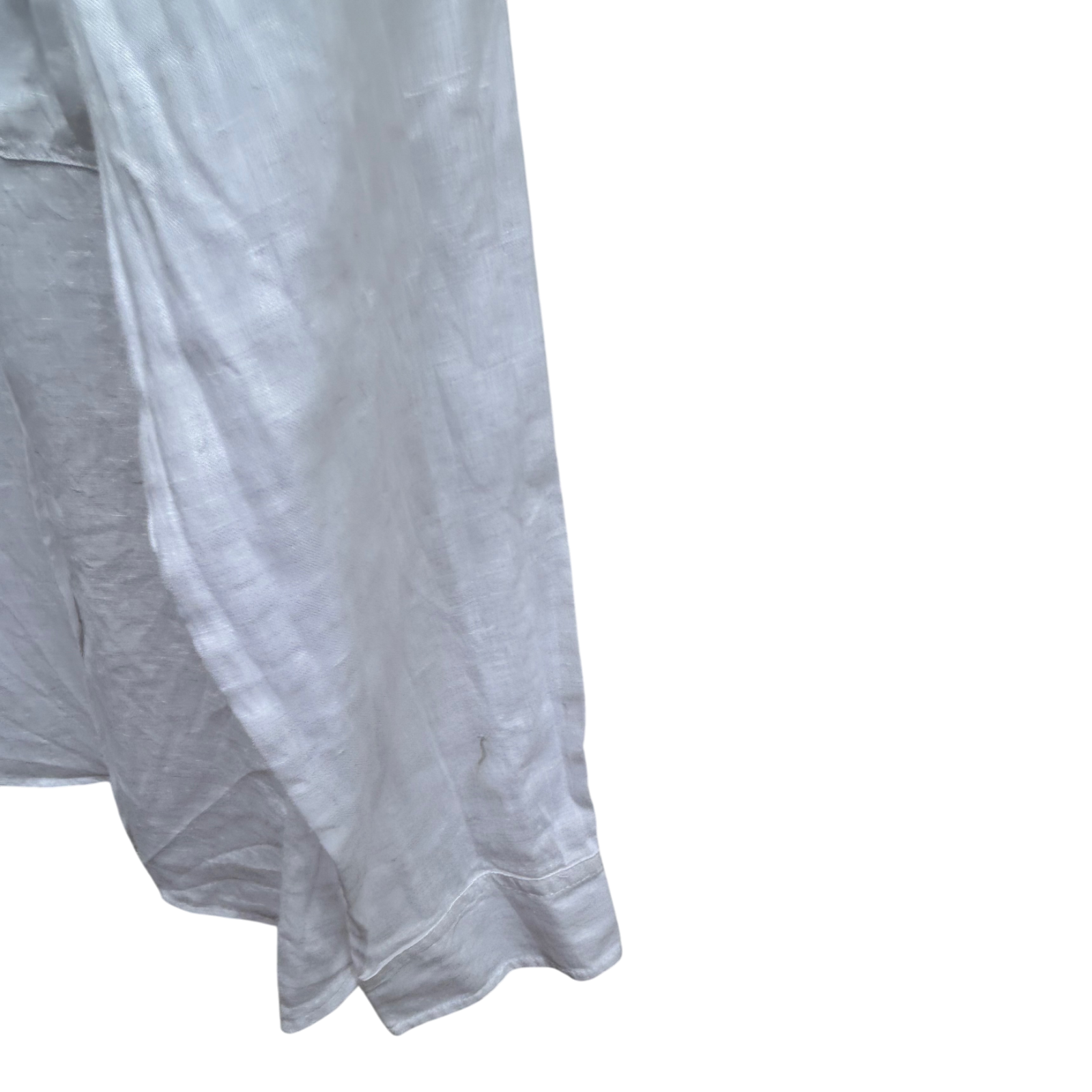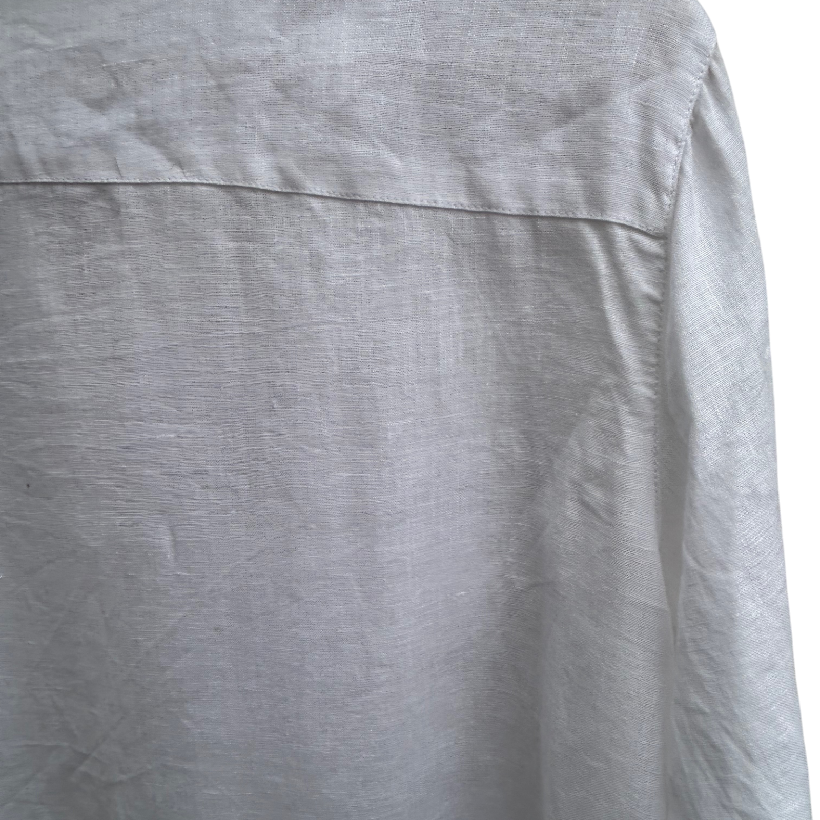Edle Leinenbluse von Brax in Größe 42 aus 100 % Leinen. Brustweite 54 cm, Länge 75 cm, Ärmellänge 65 cm. Die weiße Hemdbluse überzeugt durch ihr hochwertiges Material und ihre vielseitigen Details: mit klassischen Brusttaschen, Schulterriegeln, durchgehender Knopfleiste und praktischen Krempelärmeln, die sich zum Kurzarm umfunktionieren lassen. Das atmungsaktive Leinen sorgt für ein angenehm kühles Tragegefühl, ideal für warme Tage. Ein stilvoller Begleiter für Freizeit, Büro oder Urlaub – zeitlos, natürlich und elegant.