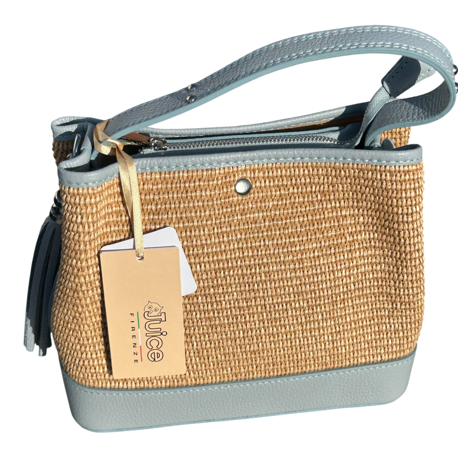 Bucket Bag Hellblau Echtleder Raffia Tasche Italien Sommer Handtasche Elegant Neu