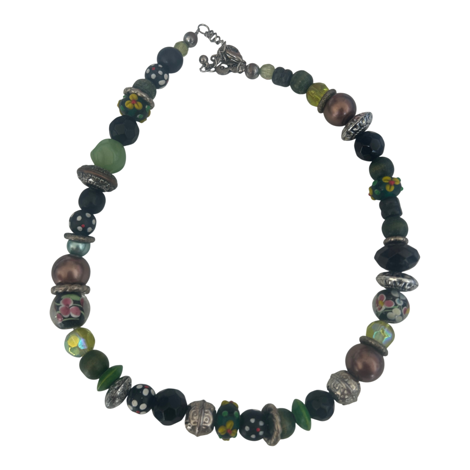 Auffällige Kette aus bunten Kunststoffperlen in verschiedenen Formen und Größen. Einige Perlen wirken wie Glas, andere sind matt oder glänzend gestaltet. Mit Karabinerverschluss und einer Länge von ca. 50 cm liegt sie angenehm am Hals. Das verspielte Farbdesign mit Blumen- und Punktemotiven macht sie zu einem besonderen Blickfang für viele Outfits. ✨🌺