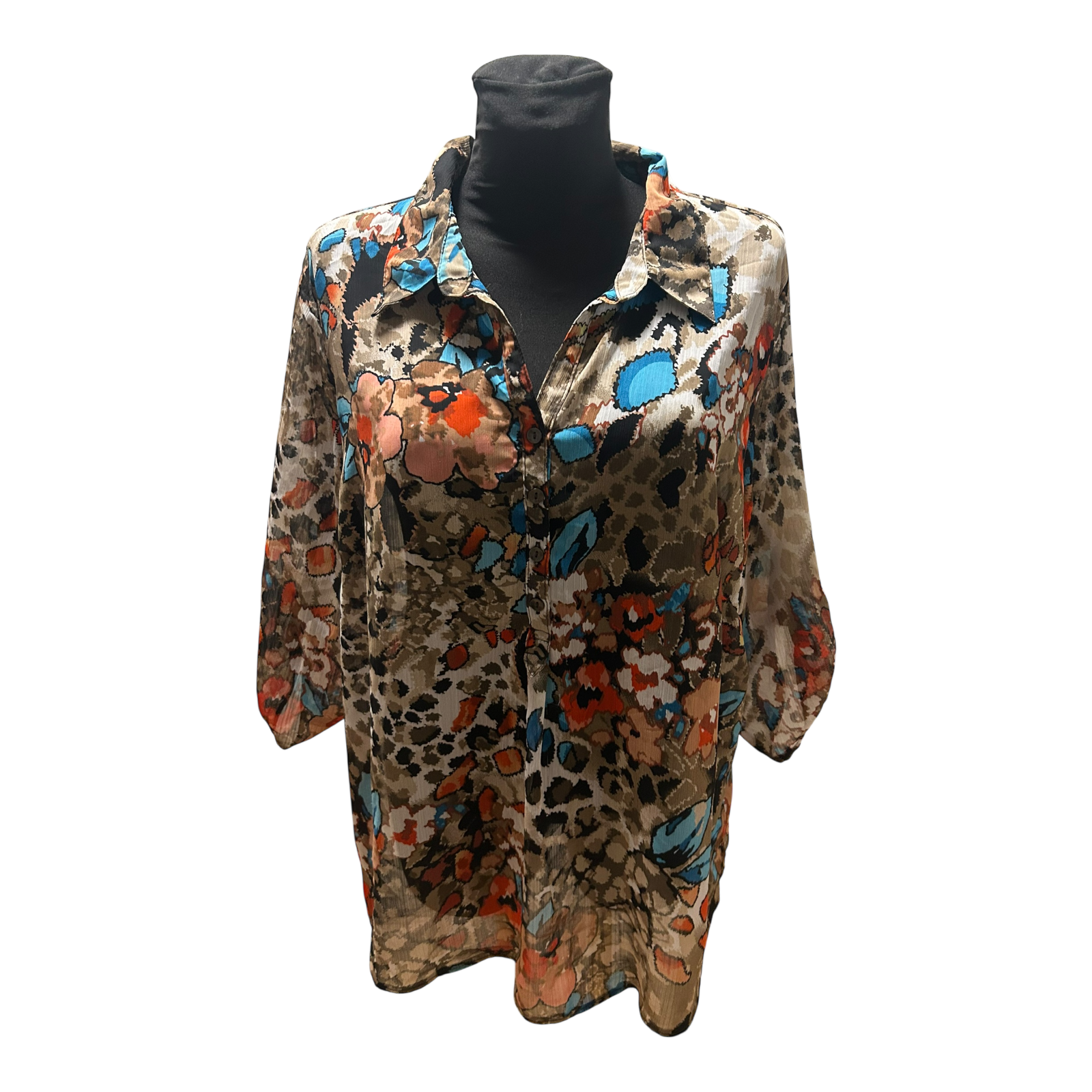 Wunderschöne Bluse von C&A in Größe 50 mit ausdrucksstarkem Muster in Braun, Blau und Rot 🌺 Die Bluse ist leicht transparent gearbeitet und besteht aus 100% Polyester. Sie verfügt über einen klassischen Kragen und eine durchgehende Knopfleiste vorne.
