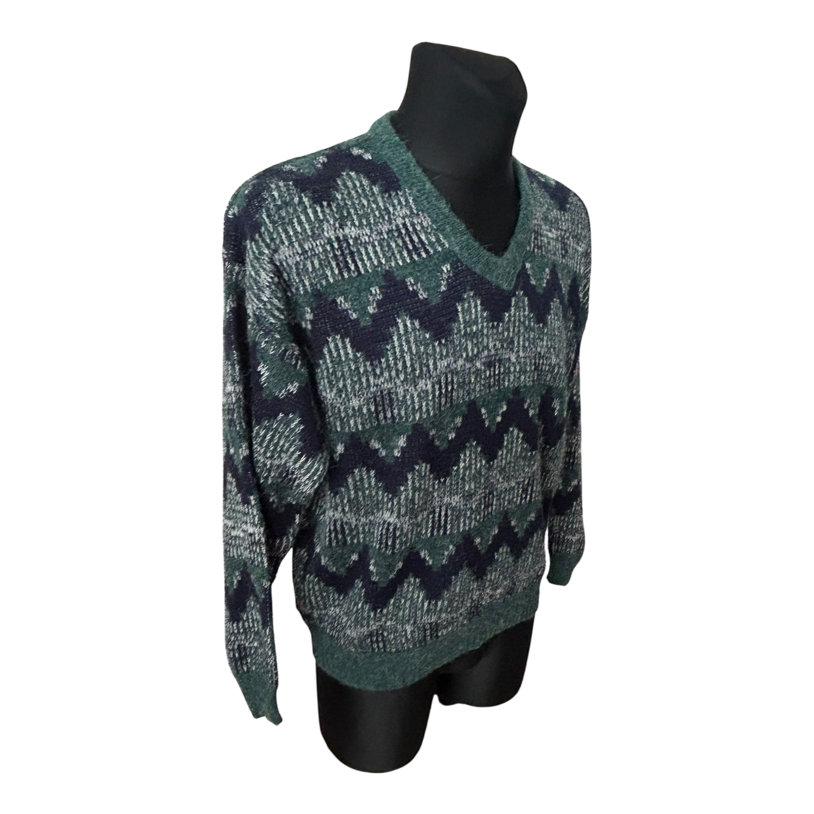 C&A Vintage Herren Pullover Grün Blau Muster Strick Gr L 52 Retro V-Ausschnitt