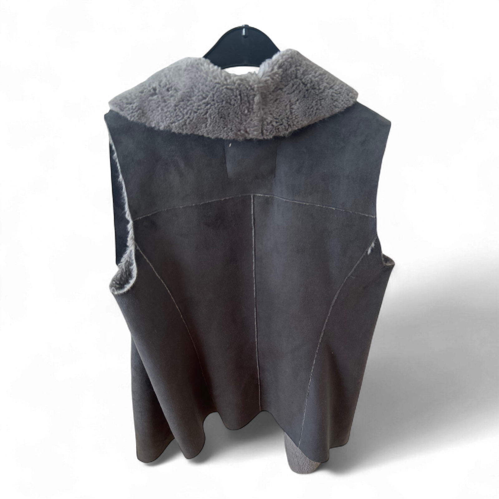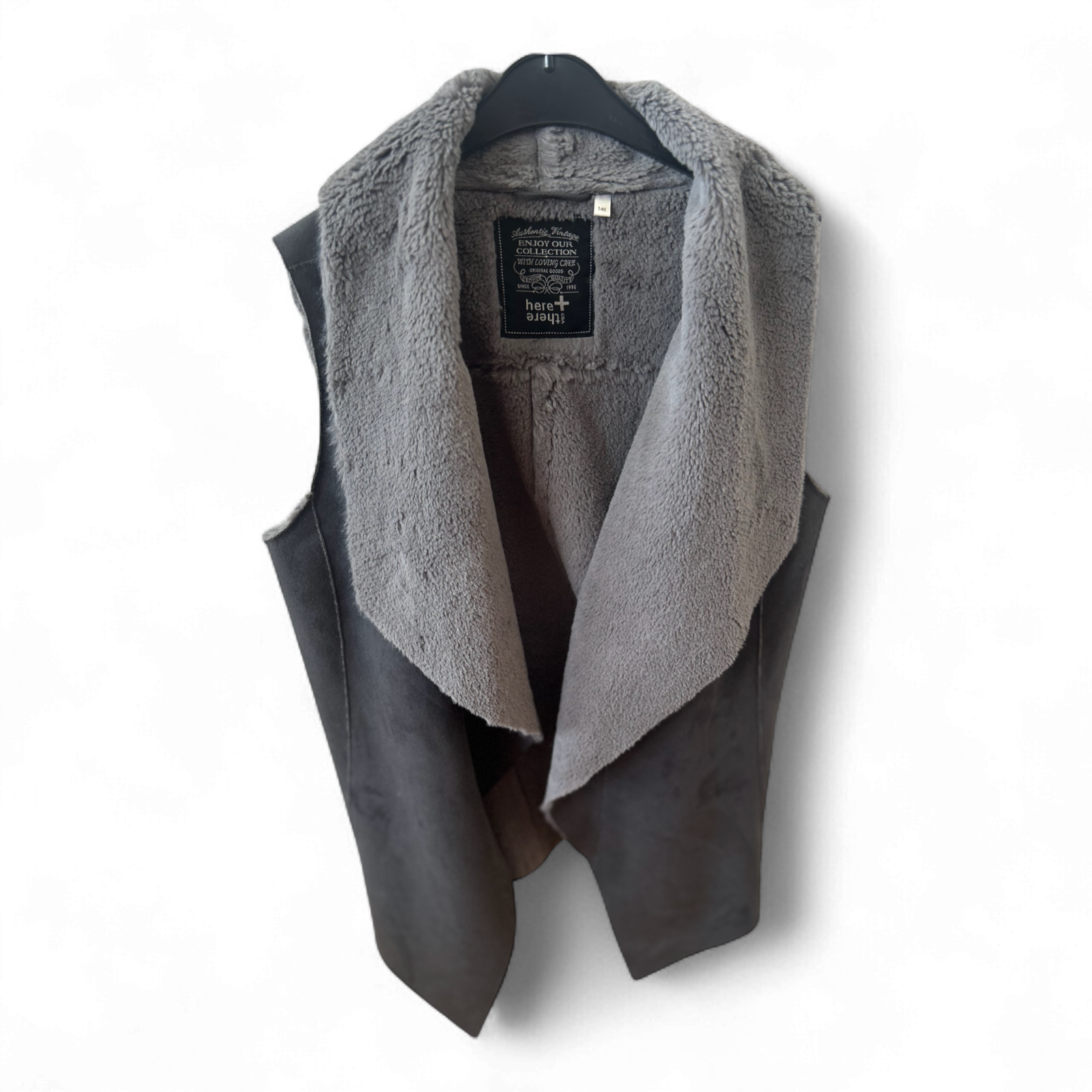 Diese kuschelige Weste von C&A (here+there) in Größe 146 passt auch Damen mit Größe M 🌟. Sie besticht durch ihr weiches, flauschiges Futter in hellem Grau und eine offene, asymmetrische Vorderpartie – ideal zum Drüberziehen im Herbst 🍂 oder für coole Lagenlooks. Das glatte Außenmaterial in dunklem Grau wirkt wie Veloursleder, ist aber pflegeleicht. Der große Kragen sorgt für extra Wärme und einen stylischen Look 🧸.