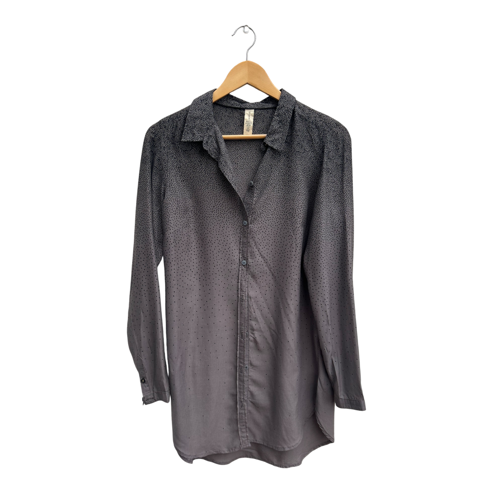 Edle Longbluse von Campus in Größe S aus 100 % Viskose. Brustweite 48 cm, Länge 85 cm, Ärmellänge 66 cm. Die Bluse zeigt ein feines Punktemuster in Grau-Schwarz mit leichtem Farbverlauf, was ihr eine elegante, fließende Optik verleiht. Durch den leichten Stoff trägt sie sich besonders angenehm und fällt weich. Mit klassischem Kragen, durchgehender Knopfleiste und leicht abgerundetem Saum – perfekt kombinierbar zu Leggings, Jeans oder schmalen Stoffhosen. Ein vielseitiges Stück für Büro, Freizeit oder Abendlooks.
