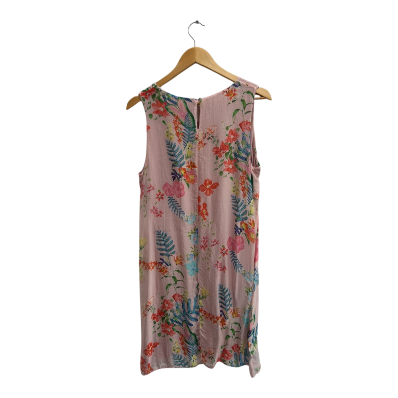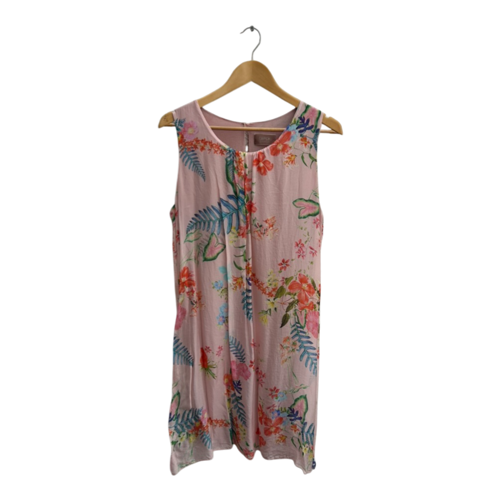Dieses ärmellose Kleid von Cartoon in Größe 40 ist ein idealer Begleiter für warme Sommertage ☀️. Der rosafarbene Grundton wird durch ein farbenfrohes, florales Muster stilvoll ergänzt. Das Kleid ist weich fließend, leicht ausgestellt geschnitten und vollständig gefüttert. Aufgrund des fehlenden Etiketts wird das Obermaterial vermutlich aus Seide bestehen, das Futter aus Viskose.