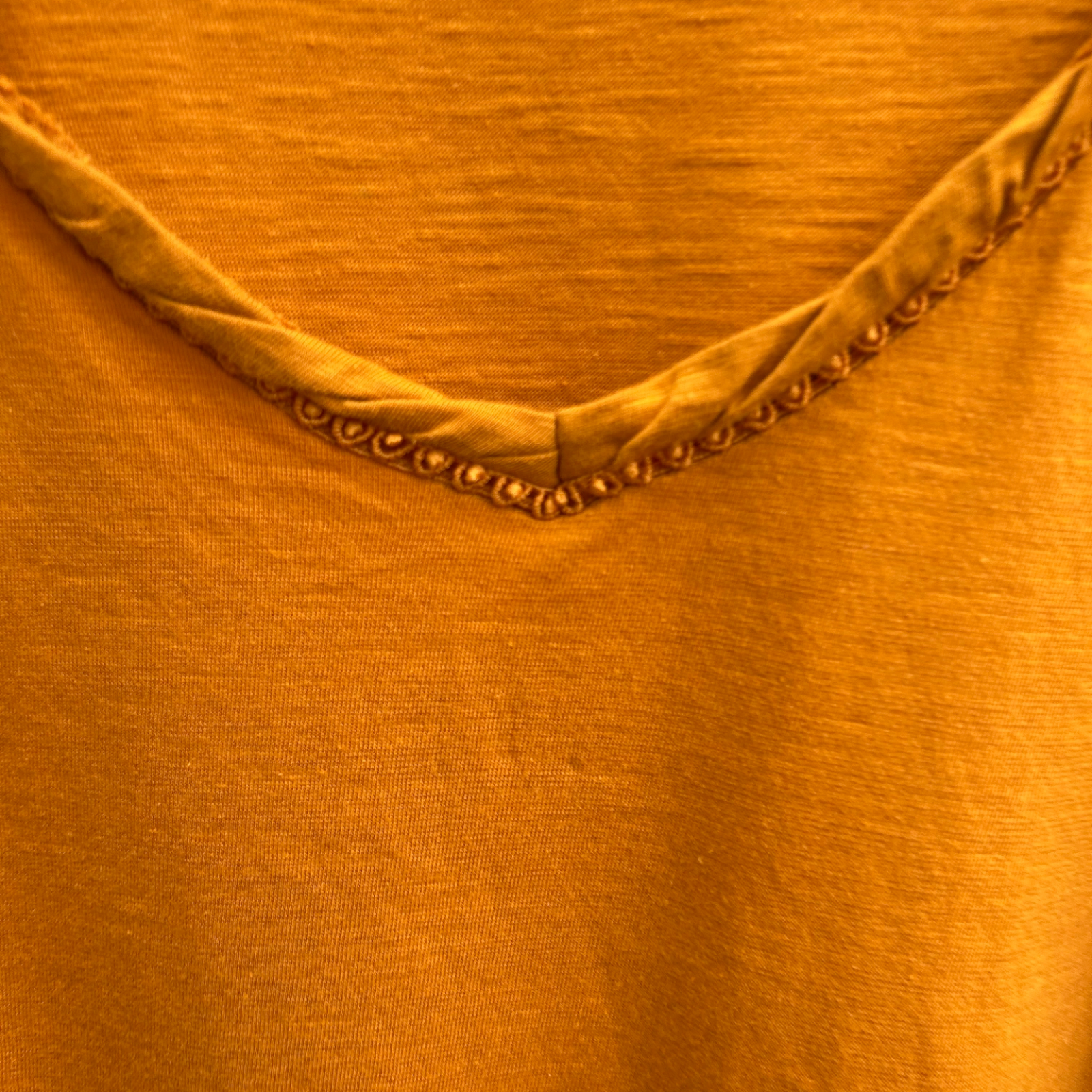 Luftig geschnittenes Shirt von Yessica in Größe XL aus 78 % Baumwolle und 22 % Modal. Die Brustweite beträgt 58 cm, die Länge 75 cm. Das Oberteil besticht durch seinen warmen Orangeton und den dekorativen, leicht verspielten V-Ausschnitt mit feiner Kantenverzierung. Der weiche Stoff fällt angenehm locker und ist ideal für warme Tage oder als frisches Farbakzentstück im Alltag geeignet. 🌿