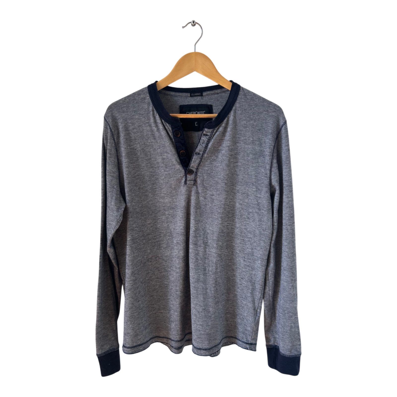 Lässiges Herren-Longsleeve von Cherokee Classic in Größe L. Das Shirt ist in Grau gehalten und mit dunkelblauen Kontrasten an Kragen und Bündchen versehen. Durch den Henley-Ausschnitt mit Knopfleiste wirkt es sportlich und gleichzeitig stilvoll.