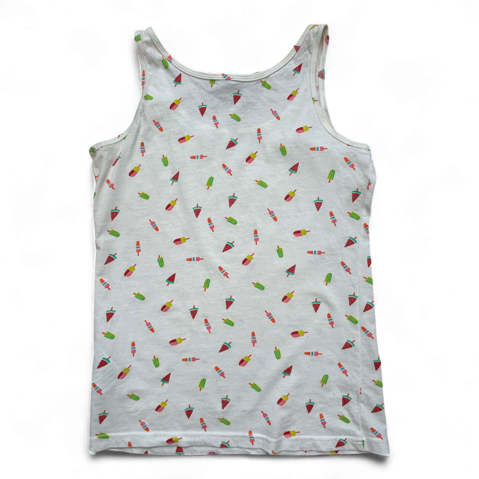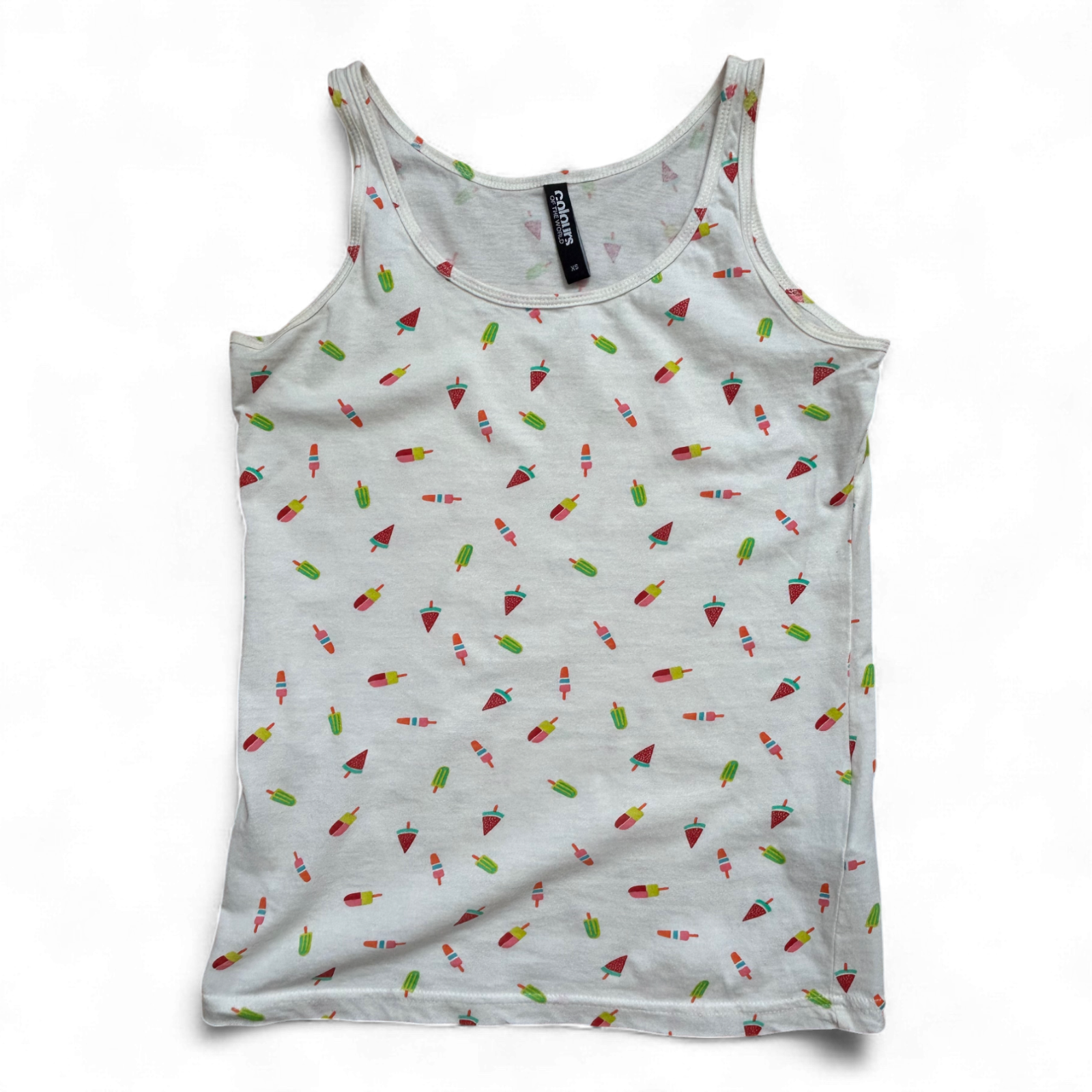 Verspieltes Damen-Tanktop von Colours of the World in Größe XS mit süßem Eis- und Wassermelonen-Muster. Aus 100 % Baumwolle, angenehm weich und luftig – ideal für heiße Tage ☀️. Die klassische ärmellose Passform und der Rundhalsausschnitt machen es zum sommerlichen Basic mit Spaßfaktor.