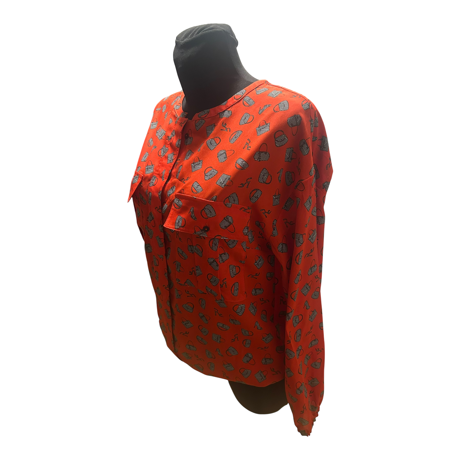 Diese auffällige Damenbluse in kräftigem Rot mit schwarzem Allover-Muster ist ein echter Hingucker ❤️ Die Bluse verfügt über eine verdeckte Knopfleiste, zwei markante Brusttaschen sowie einen leicht hochstehenden Kragen. Die Ärmel sind angenehm weit geschnitten und schließen mit einem Gummizug ab, ebenso sorgt der elastische Saum für einen locker fallenden Sitz.