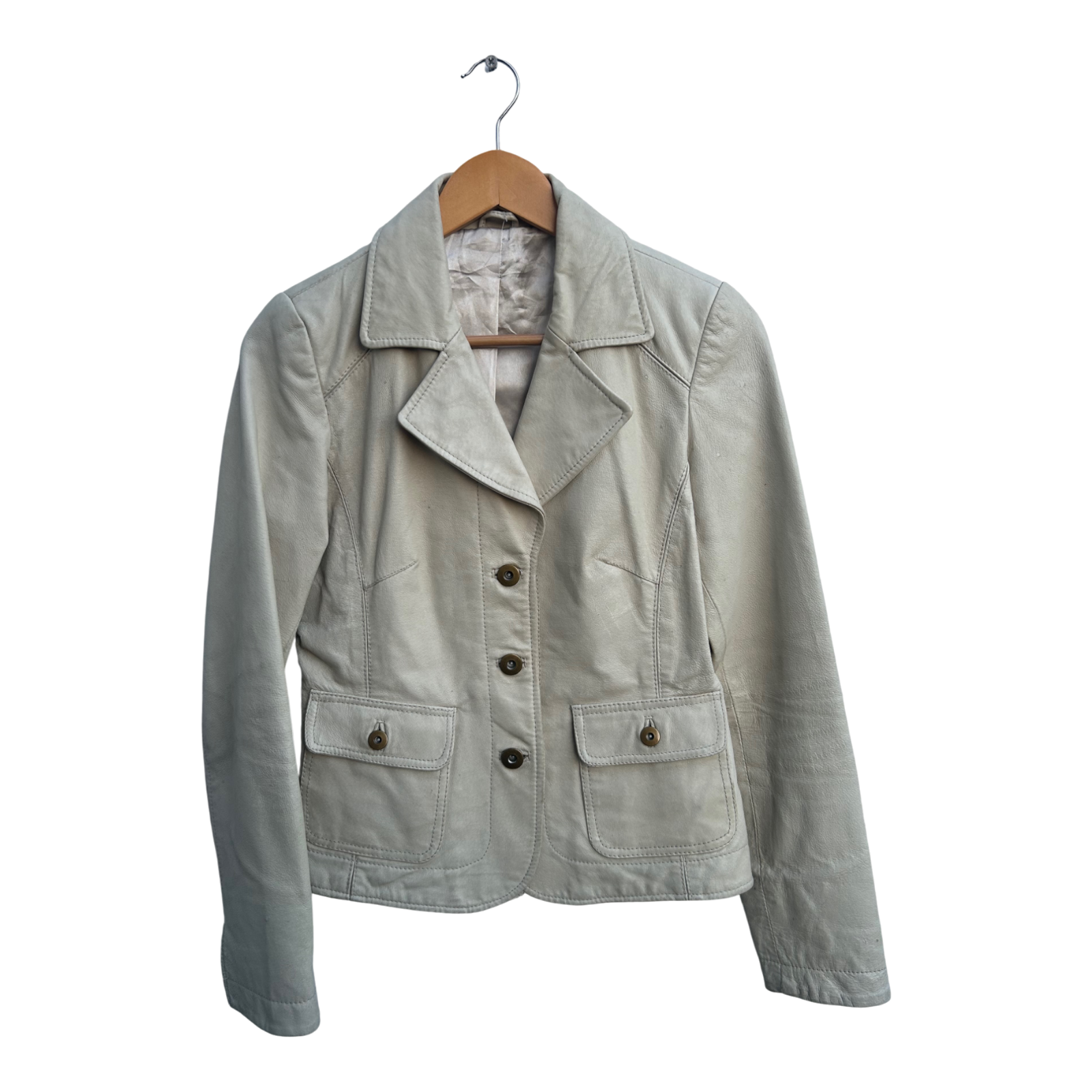Elegante Damen-Lederjacke in Größe 36 in edlem Beigeton. Das Modell ist aus festem, hochwertigem Echtleder gefertigt und überzeugt durch seinen klassischen Blazer-Schnitt mit Reverskragen und aufgesetzten Taschen.