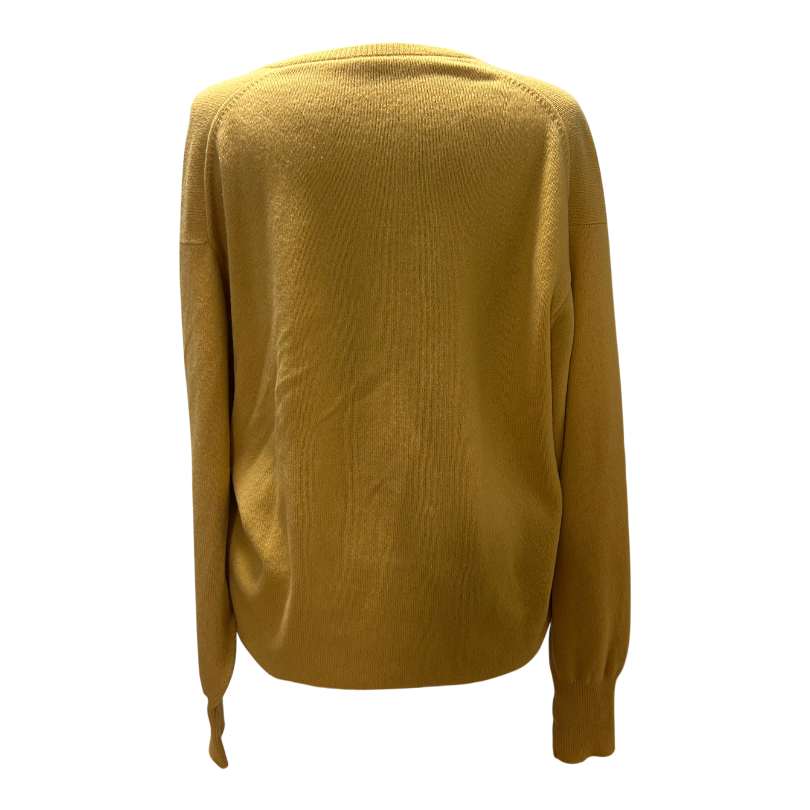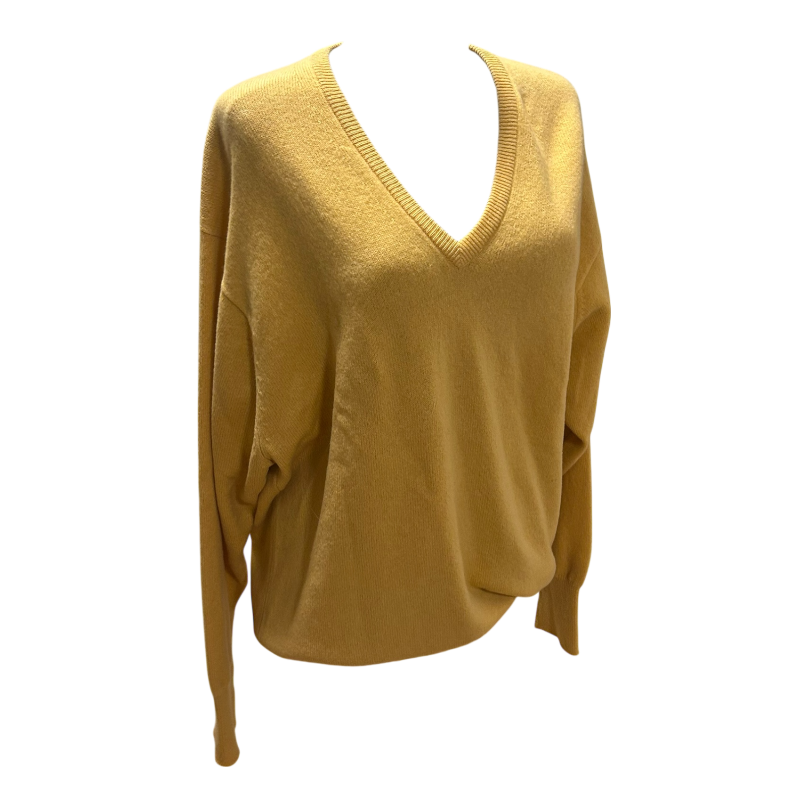 Wunderschöner Damenpullover in Größe 42 aus 100% Schurwolle in einem edlen, warmen Gelbton. Das Modell überzeugt durch seinen großzügigen, modernen Schnitt und den femininen V-Ausschnitt, der eine elegante Silhouette schafft und zugleich lässig wirkt.