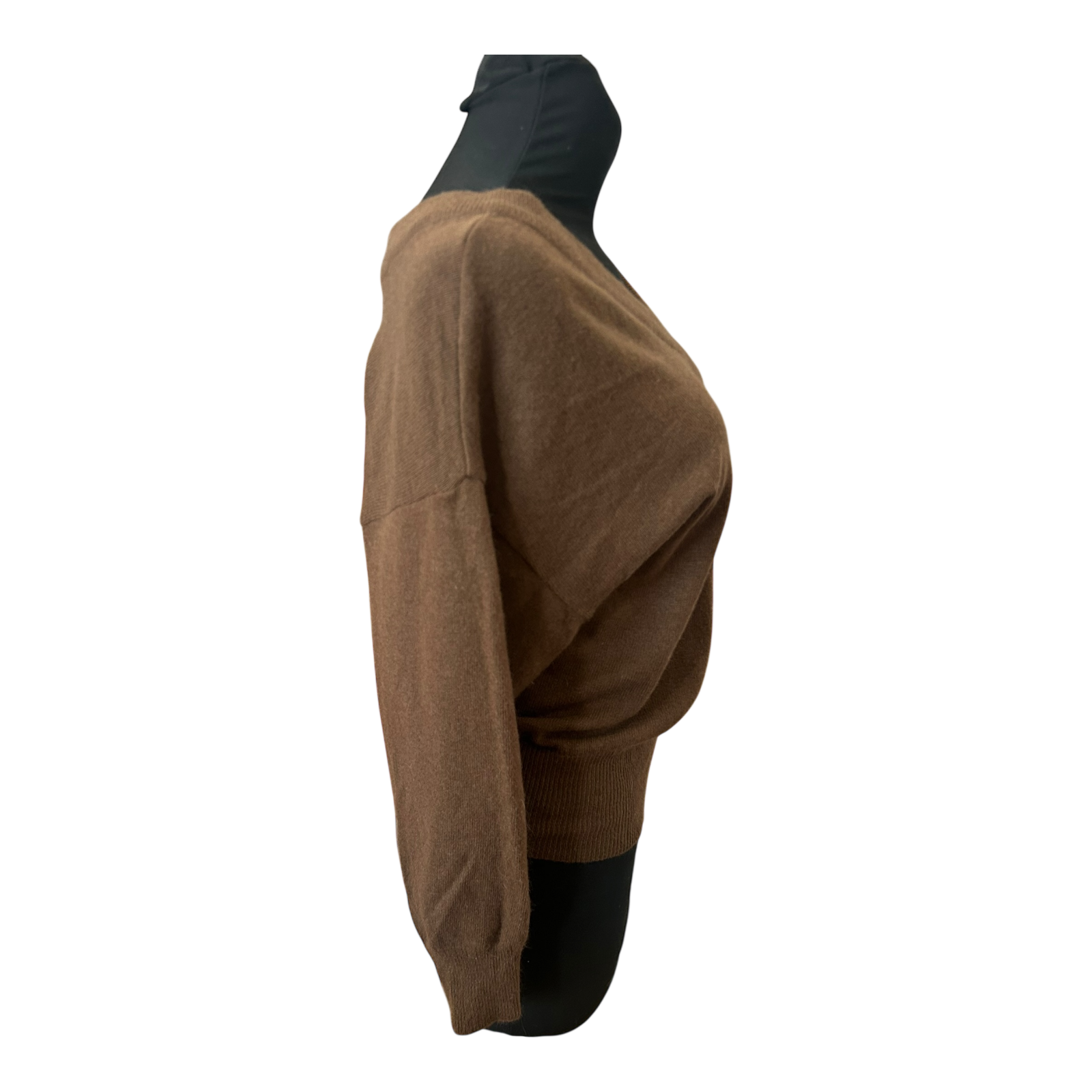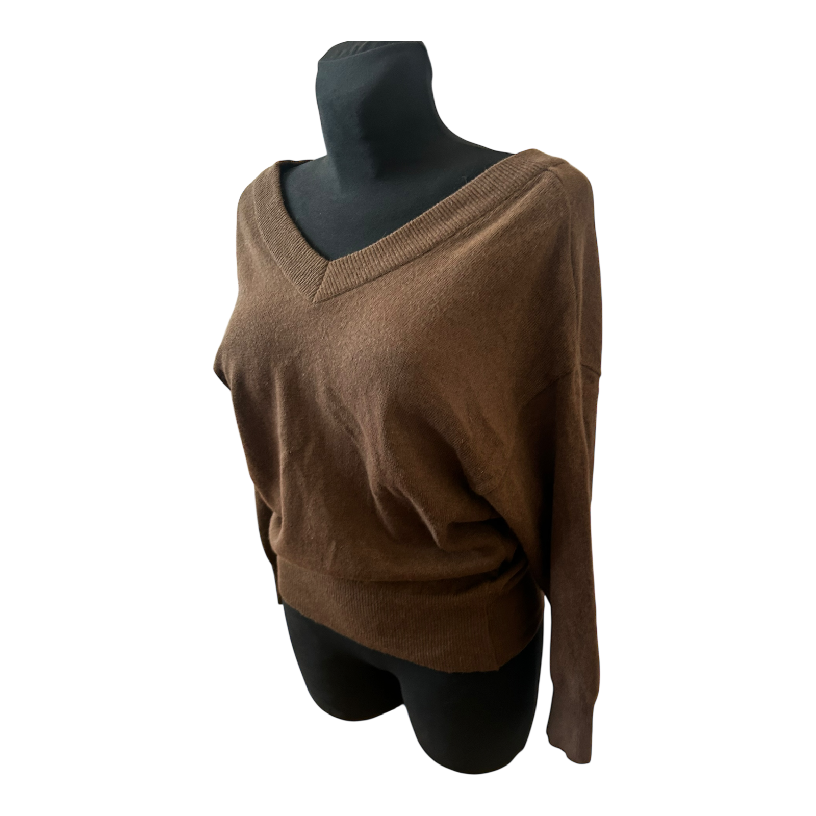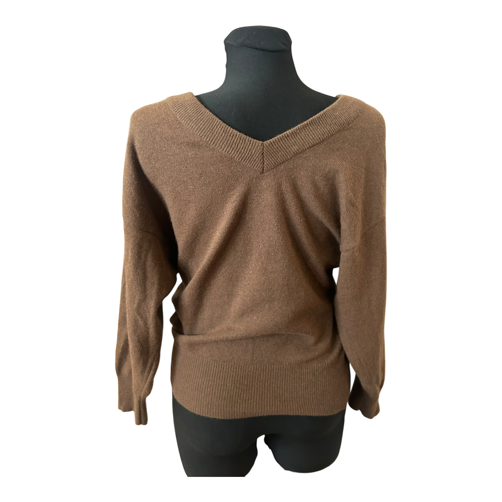 Weicher dunkelbrauner Damenpullover in Größe 36 mit klassischem V-Ausschnitt und 3/4-Ärmeln. Der Feinstrick liegt angenehm auf der Haut und eignet sich ideal für den Alltag, das Büro oder entspannte Freizeitlooks. Der Schnitt fällt feminin und bequem, mit einer Brustweite von etwa 48 cm, einer Gesamtlänge von rund 60 cm und 3/4-Ärmeln mit einer Länge von ca. 48 cm. Durch die hochwertige Wollmischung wirkt der Pullover warm, leicht und sehr angenehm zu tragen. ✨