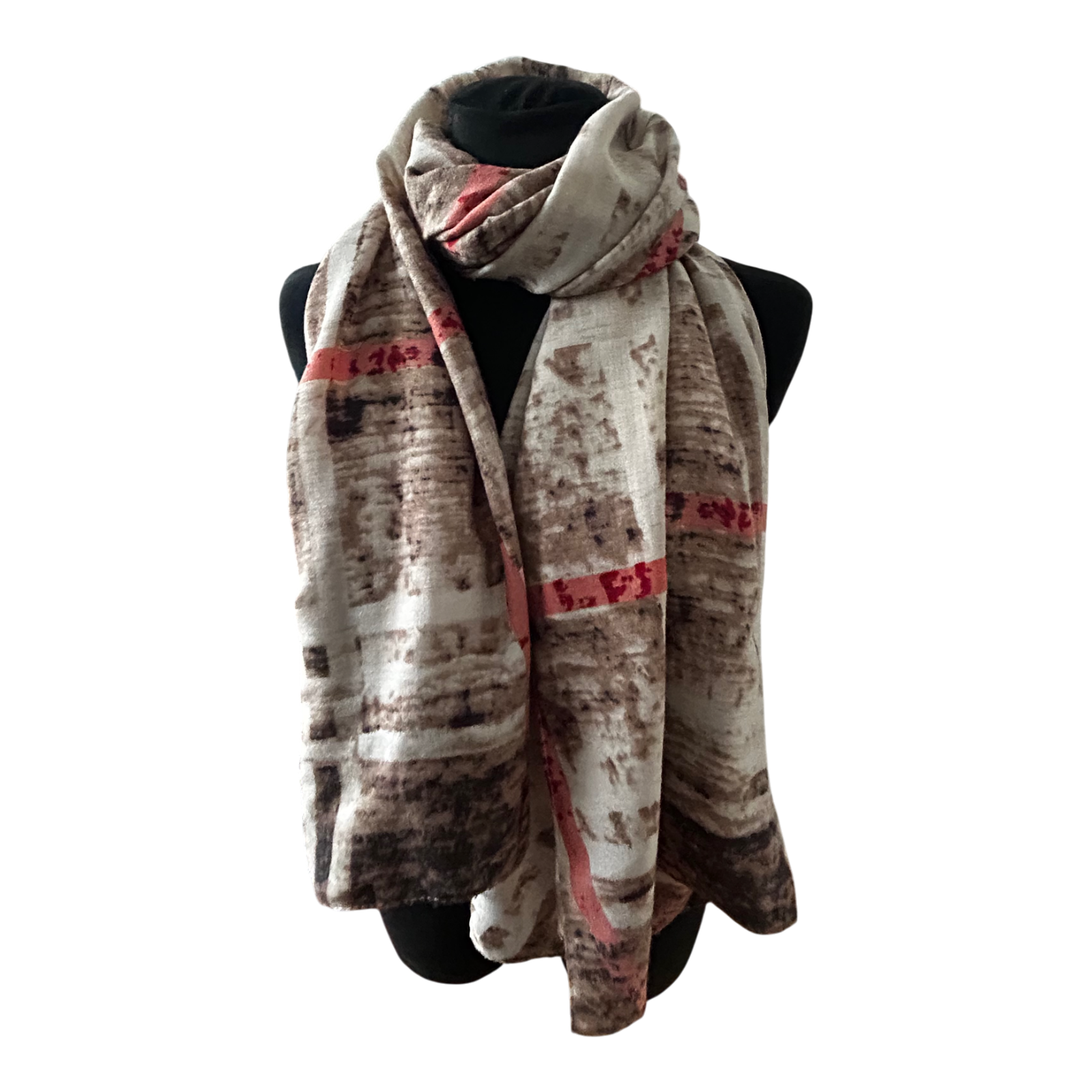 Dieser wunderschöne Damen-Schal überzeugt durch sein harmonisches Farbspiel in Braun, Creme und dezenten Rotnuancen. Das grafisch-abstrakte Muster wirkt ruhig und elegant und lässt sich vielseitig kombinieren – ob zum Mantel, Blazer oder Strick.