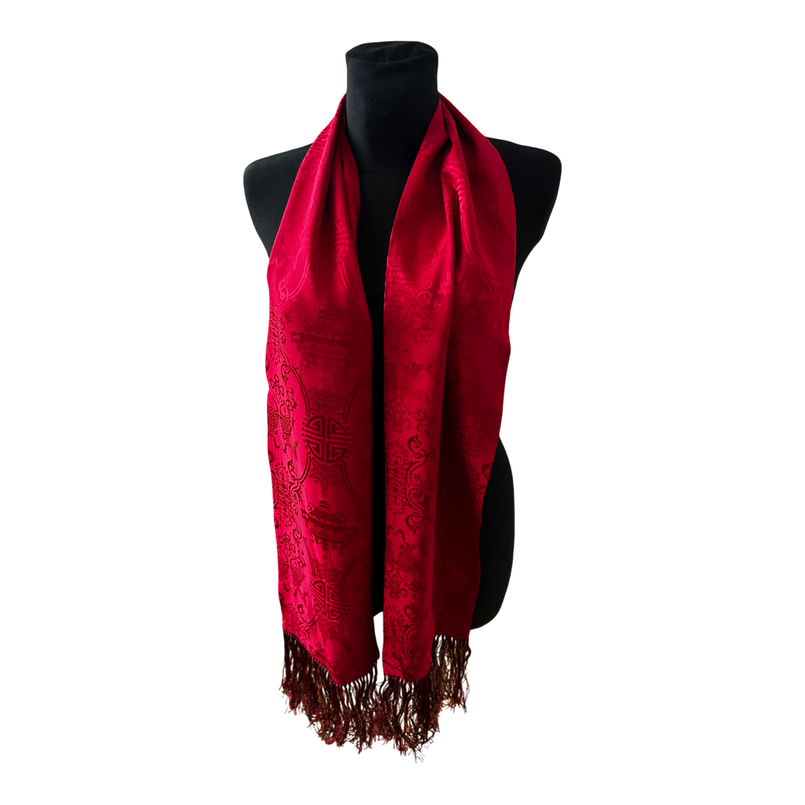 Dieser edle Asia-Schal aus 100% reiner Seide überzeugt durch sein ausdrucksstarkes Design in kräftigem Rot und tiefem Schwarz.