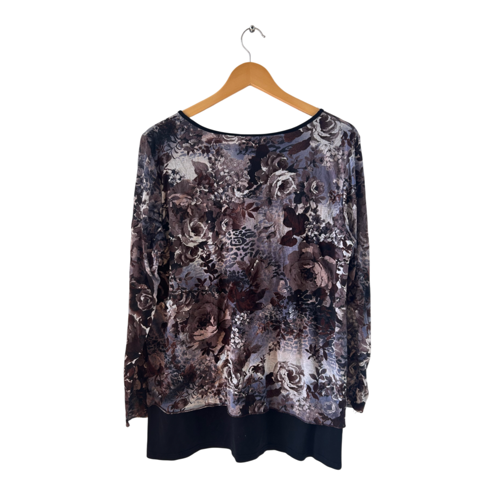 Feminin bedrucktes Damen Shirt in Größe XL. Das Oberteil zeigt ein detailreiches Blumenmuster in Braun, Grau und Lila und hat einen doppellagigen Look mit angesetztem Saum. Mit einer Brustweite von ca. 55 cm und einer Länge von ca. 70 cm sitzt es locker und bequem. Gefertigt aus 95 % Viskose und 5 % Elasthan bietet es angenehmen Tragekomfort und einen leichten Stretch-Effekt. 🌸 Ein vielseitiges Oberteil, das sich ideal für Freizeit und Büro kombinieren lässt.