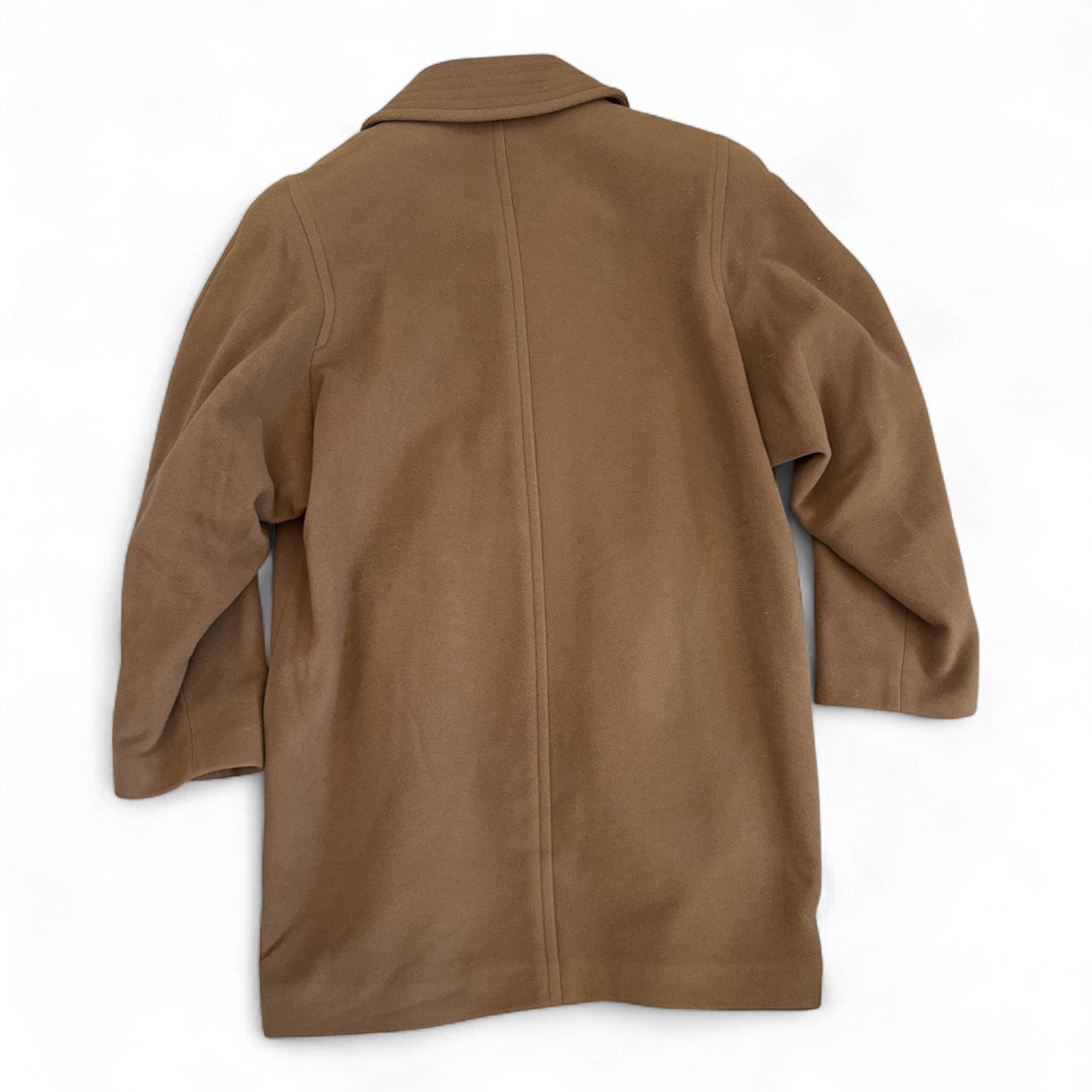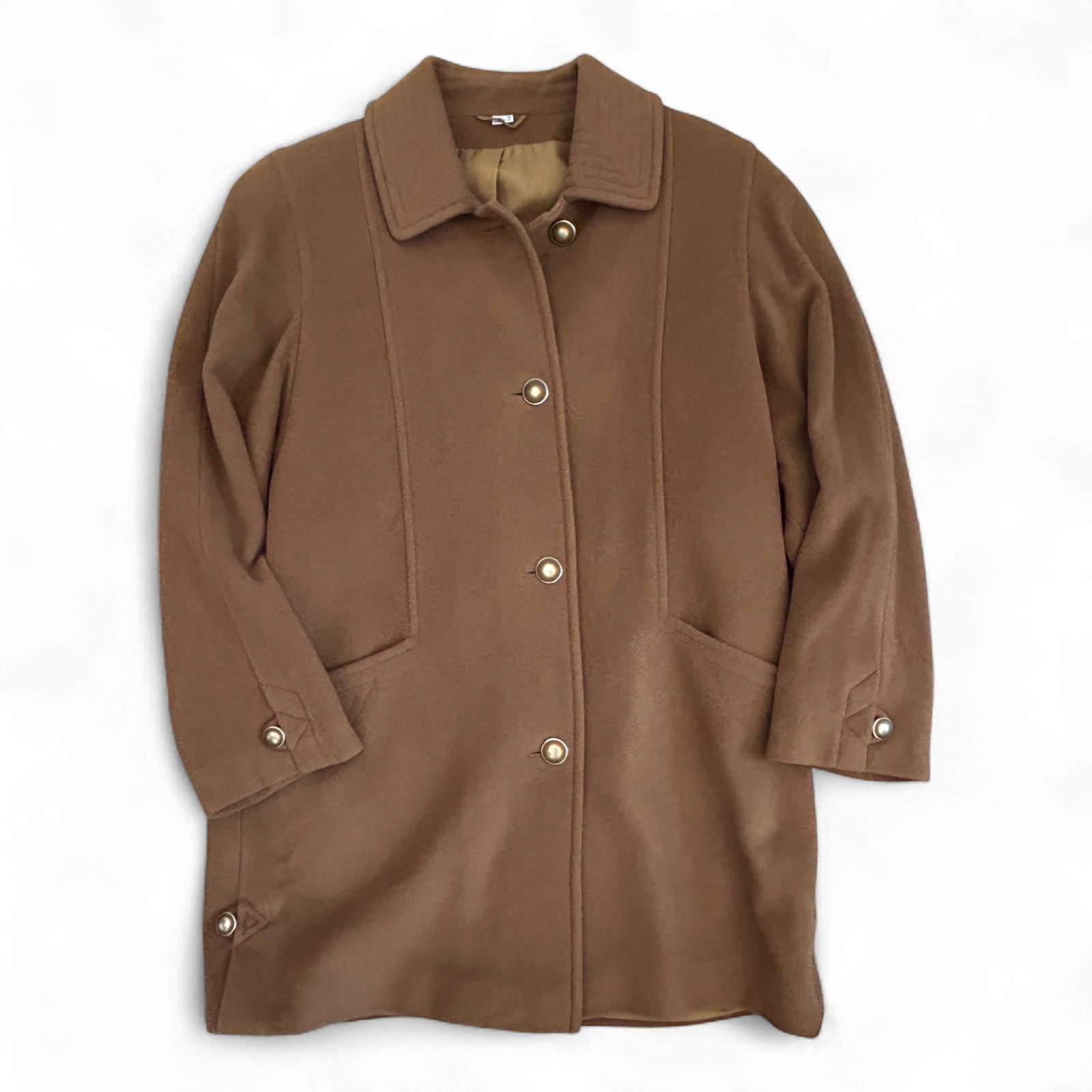 Eleganter, klassisch geschnittener Damenmantel in warmem Braunton – ein echter Vintage-Schatz! ✨ Die Jacke besteht aus einem hochwertigen Mix aus 70 % Schurwolle, 20 % Nylon und 10 % Kaschmir. Das beige Innenfutter sorgt für angenehmen Tragekomfort. Besonders auffällig sind die großen, dekorativen Knöpfe mit Metalloptik. Zwei praktische Eingrifftaschen runden das Design ab. Top Zustand! 💫