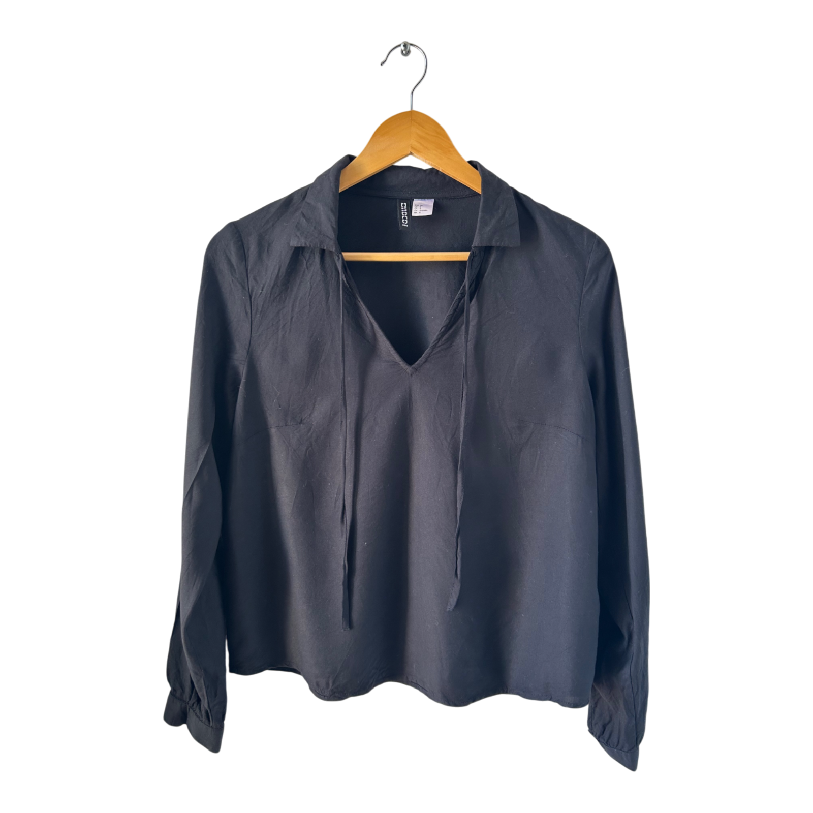 Schwarze Damen Bluse von Divided in Größe 38 aus 100 % Viskose. Das Modell hat eine lockere, gerade Passform mit V-Ausschnitt und Bindebändern, die für einen modernen und gleichzeitig femininen Look sorgen. Mit einer Brustweite von ca. 53 cm und einer Länge von ca. 54 cm sitzt die Bluse bequem und bietet vielseitige Kombinationsmöglichkeiten. Ob zu Jeans für den Alltag oder elegant gestylt fürs Büro – dieses Stück ist ein zeitloser Begleiter. ✨ Die weiche Viskose trägt sich angenehm auf der Haut und macht die Bluse zu einem Must-Have für jede Garderobe.