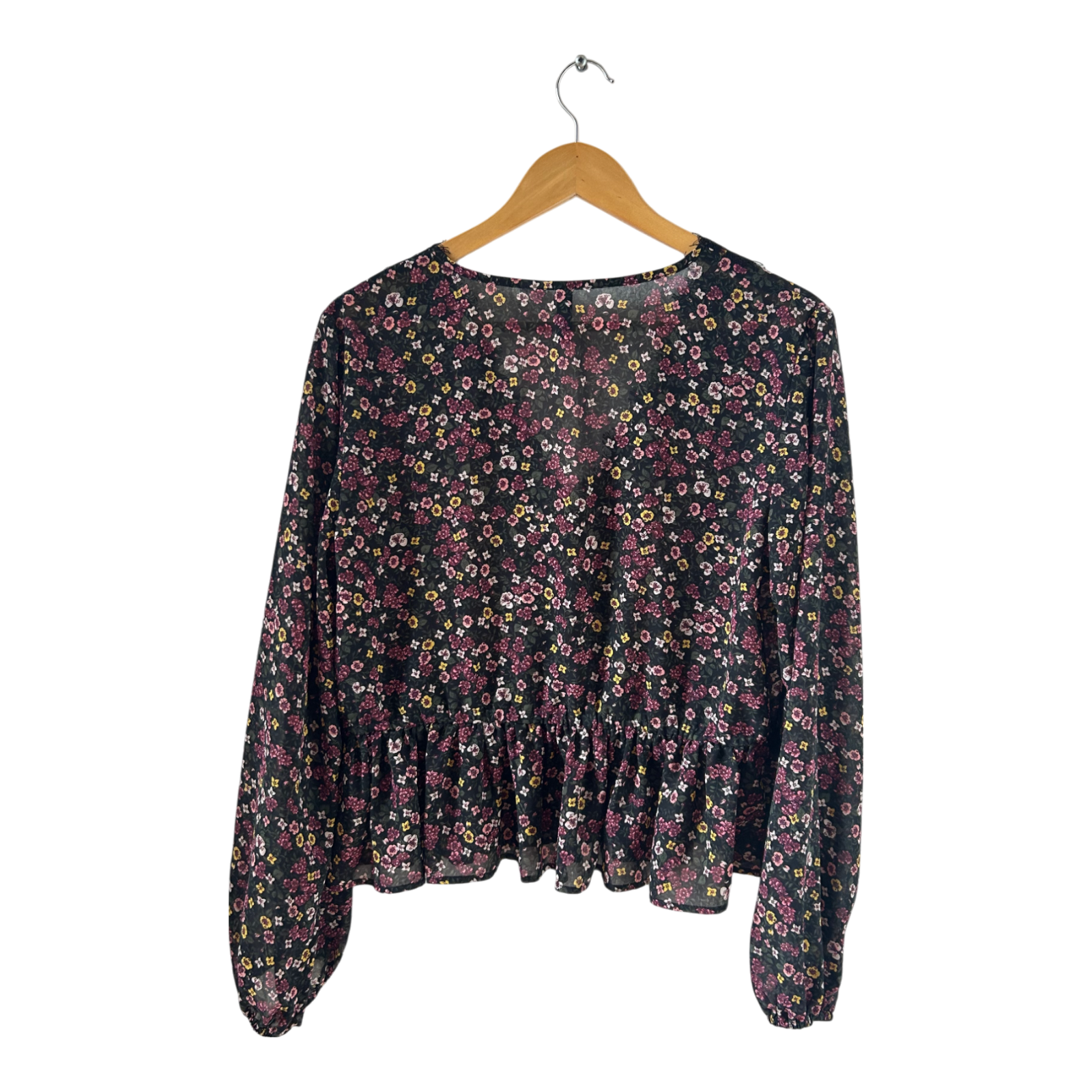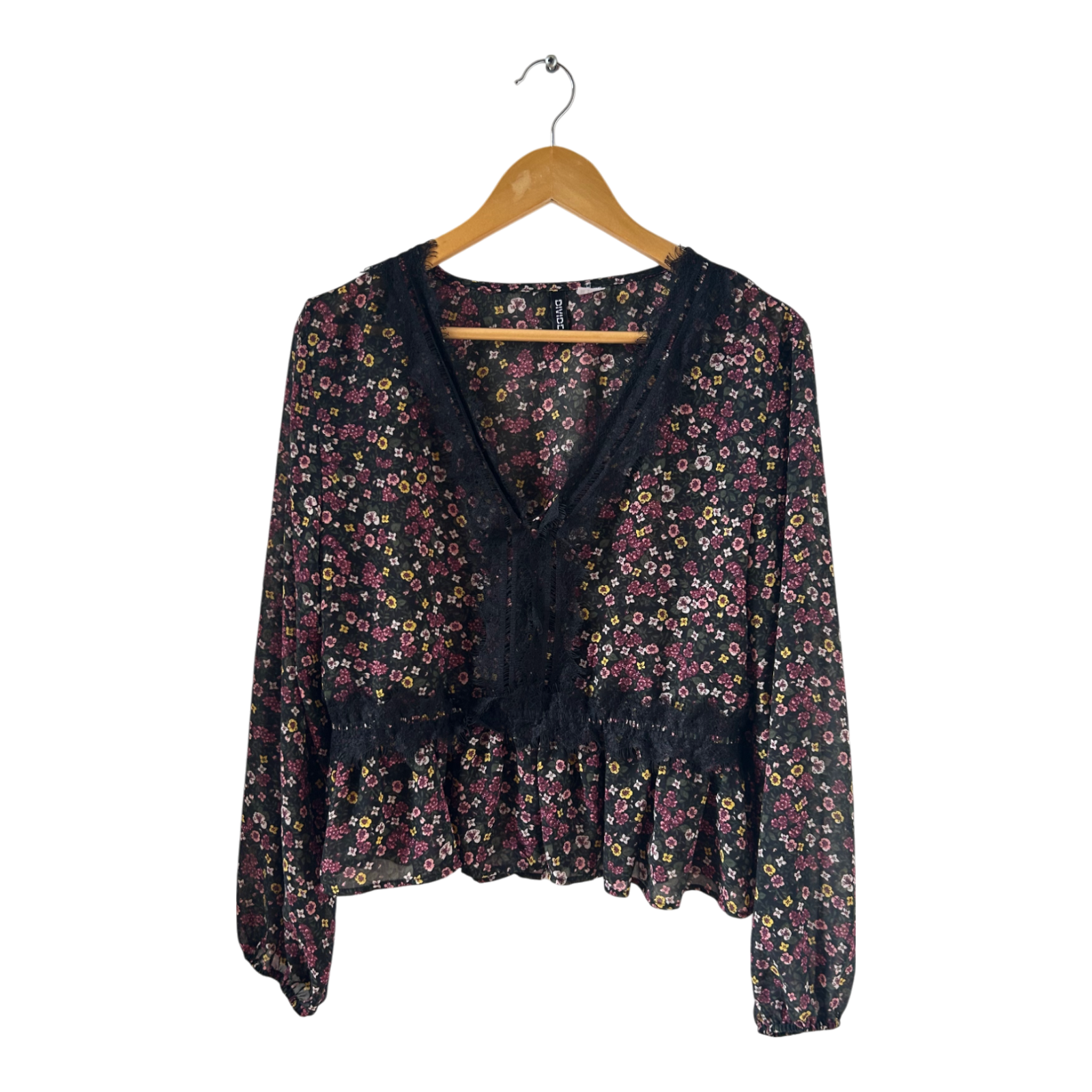 Verspielt & feminin 🌼 Diese schwarze Bluse von Divided by H&M verzaubert mit ihrem floralen Alloverprint, zarten Spitzendetails und einem leicht ausgestellten Rüschen-Saum. Der tiefe V-Ausschnitt mit Spitze und das lockere Material machen sie zum idealen Begleiter für den Alltag, Festivals oder den nächsten Abend mit Freund:innen.