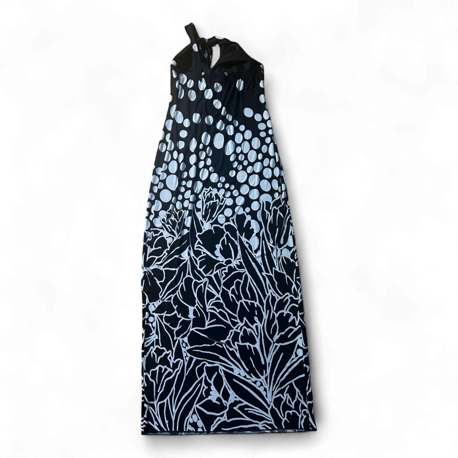 Elegantes, trägerloses Maxikleid von En Focus Studio mit auffälligem Schwarz-Weiß-Design. Der obere Bereich ist mit großen Punkten gemustert, während der untere Teil mit floralem Print verziert ist – ein ausdrucksstarker Look für Sommerabende, Events oder Urlaube. Das Kleid hat vorne eine dekorative Schleife, sitzt durch den Stretch-Anteil bequem und figurumschmeichelnd. Es besteht aus 95 % Polyester und 5 % Spandex, Brustweite ca. 36 cm, Länge ca. 130 cm.