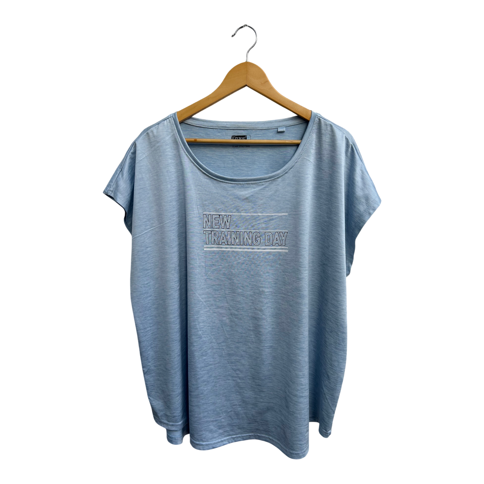 - Besonderheiten: Stretch, Weich, Lockerer Schnitt, Print „New Training Day“