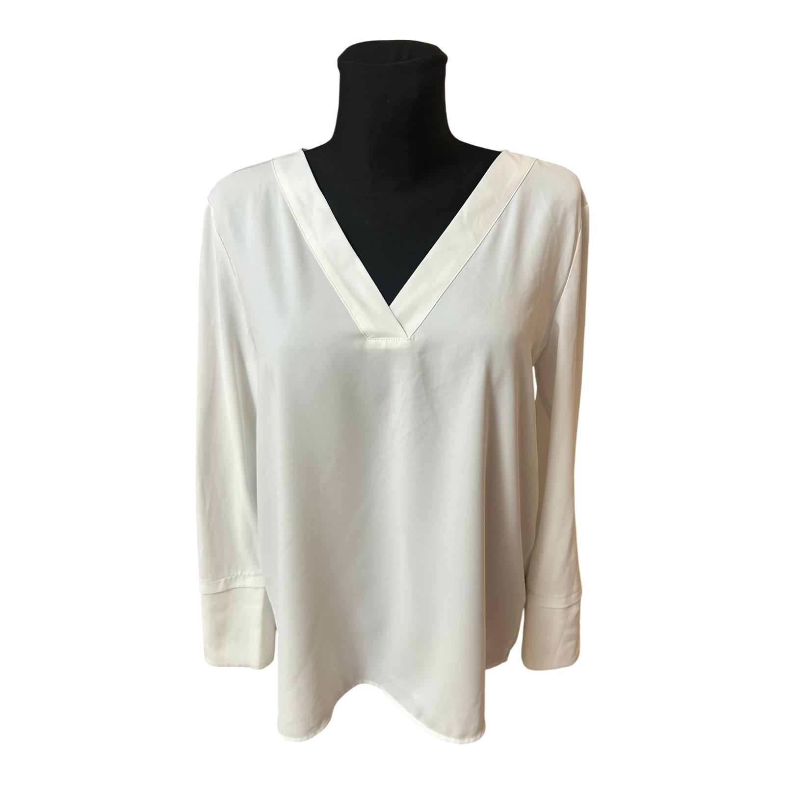 Der moderne V-Ausschnitt mit breiter Blende sorgt für eine schöne, klare Linienführung. Die langen Ärmel sind mit breiten Manschetten gearbeitet und verleihen dem Modell eine elegante Silhouette. Durch den locker fallenden Schnitt sitzt die Bluse angenehm und umspielt die Figur vorteilhaft.