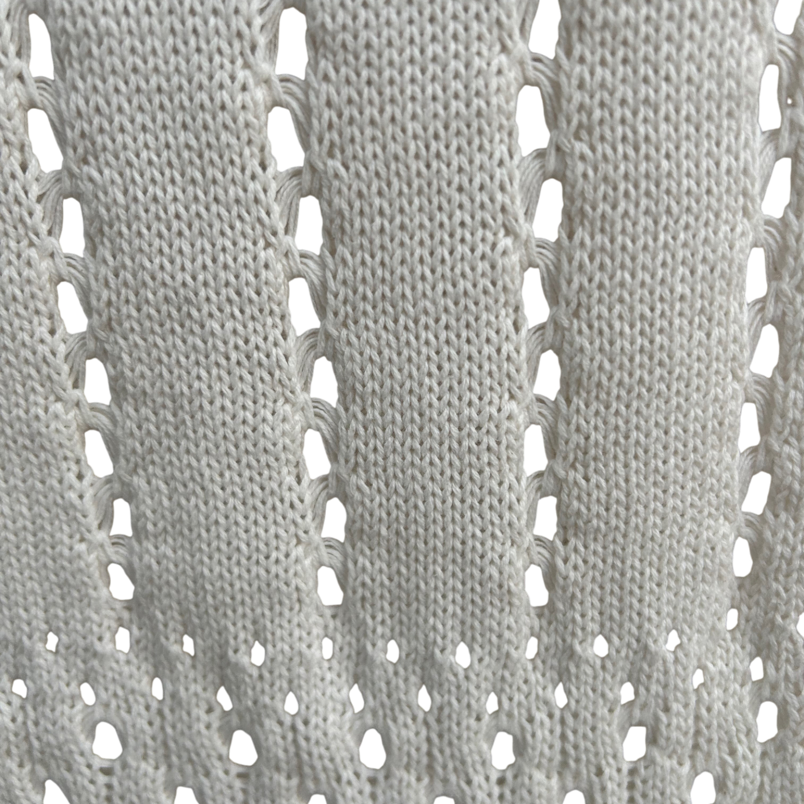 Fein gestrickte Damenweste von Esprit in zartem Weiß mit V-Ausschnitt, Knopfleiste und aufgesetzten Taschen 🌿. Die Rückseite zeigt ein auffälliges Lochmuster, das sommerlich-leicht wirkt und die Weste zu einem echten Kombiteil für warme Tage macht – ob über Bluse, Shirt oder Kleid.