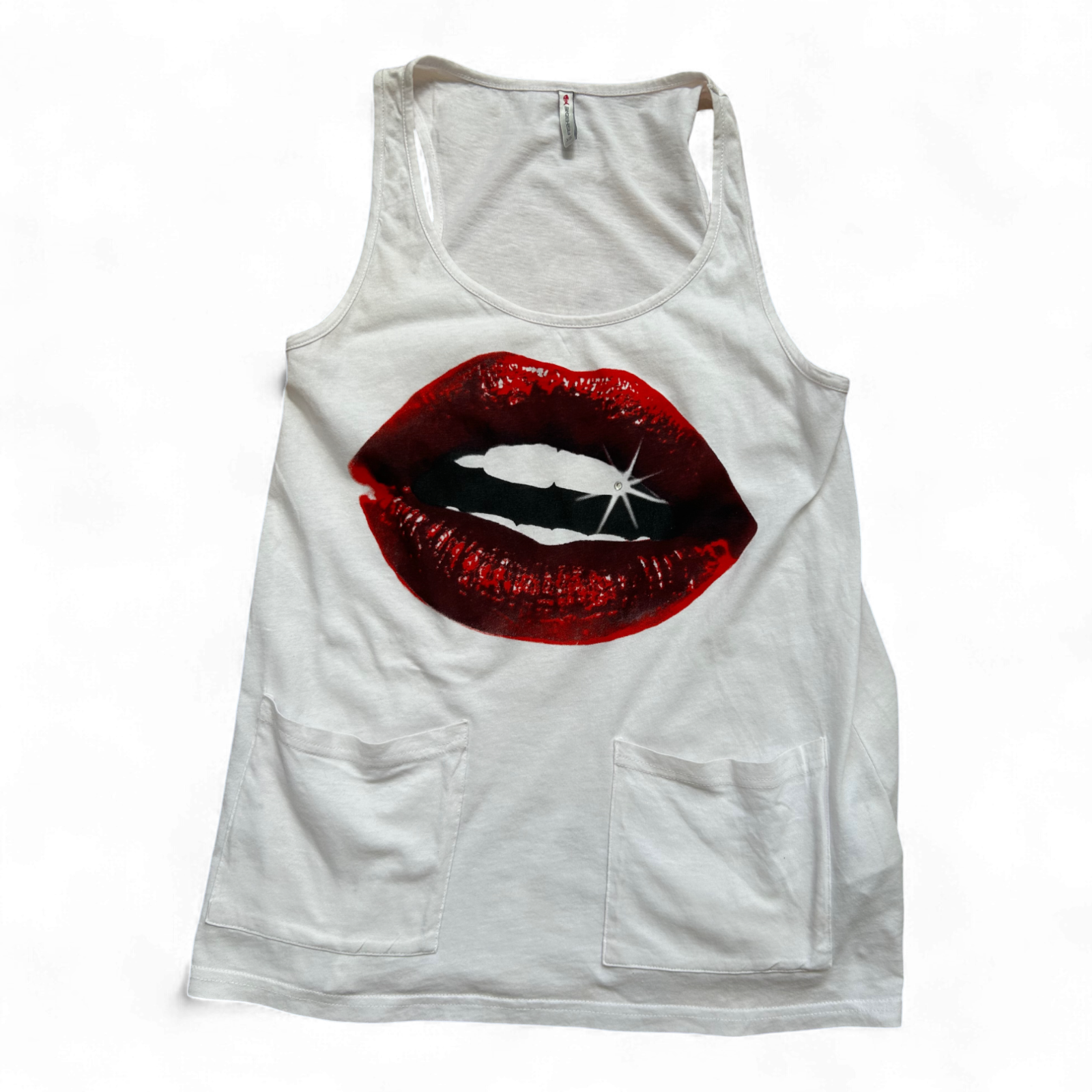 Weißes Fishbone Tanktop mit rotem Lippen-Print 💋, funkelndem Straßstein auf dem Zahn ✨ und zwei Taschen – stylisch und auffällig für heiße Tage ☀️