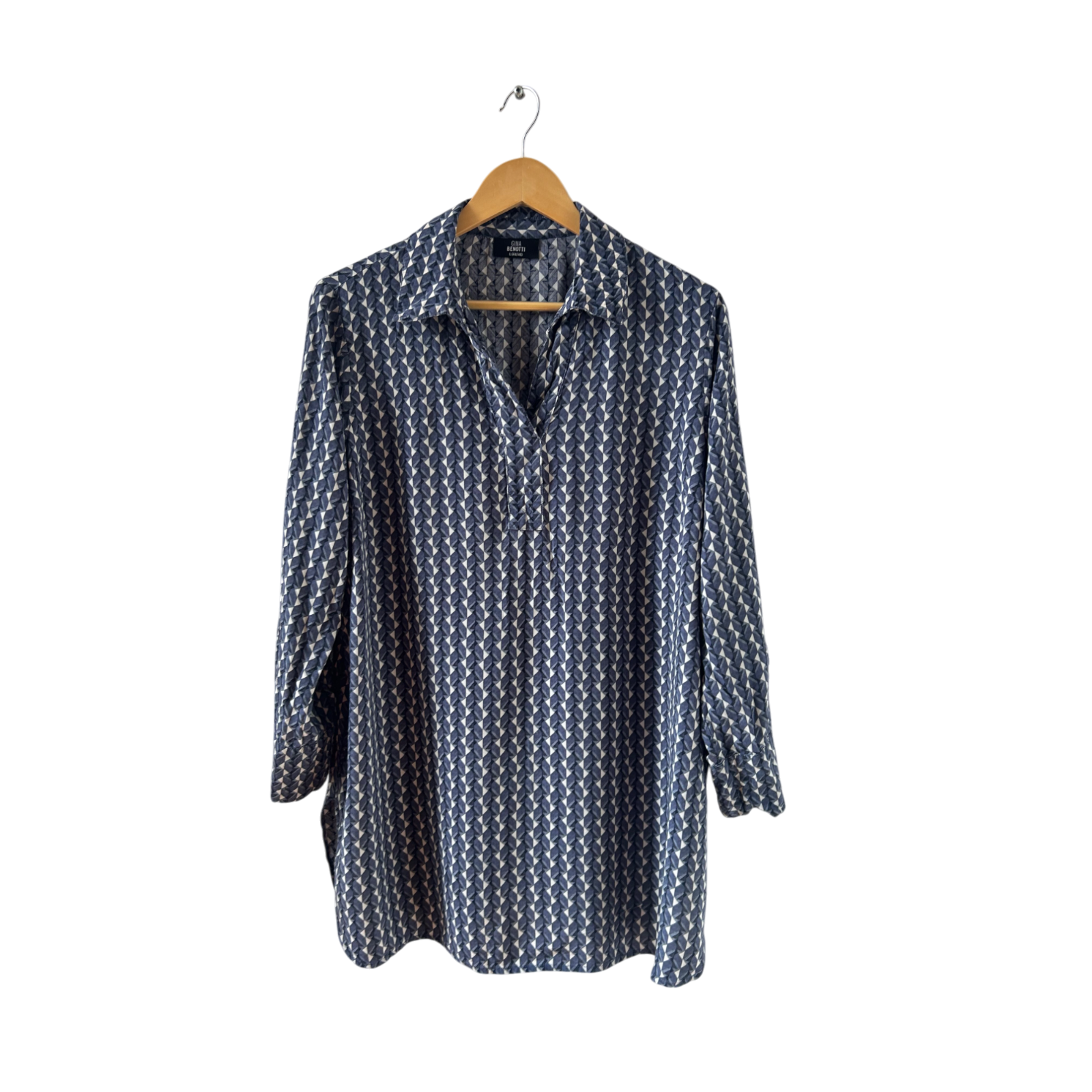 Locker geschnittene Damenbluse von Gina Benotti in elegantem Blau-Weiß-Muster. Das Modell besteht aus 100 % Viskose, fällt weich und angenehm kühl – ideal für Frühling, Sommer oder Büro-Outfits. Die Bluse hat einen klassischen Kragen, einen kurzen V-Ausschnitt und lange Ärmel mit Manschetten. Durch ihre bequeme Passform (Brustweite 64 cm, Länge 78 cm, Ärmel 58 cm) ist sie auch für kurvige Größen sehr geeignet 🌸.