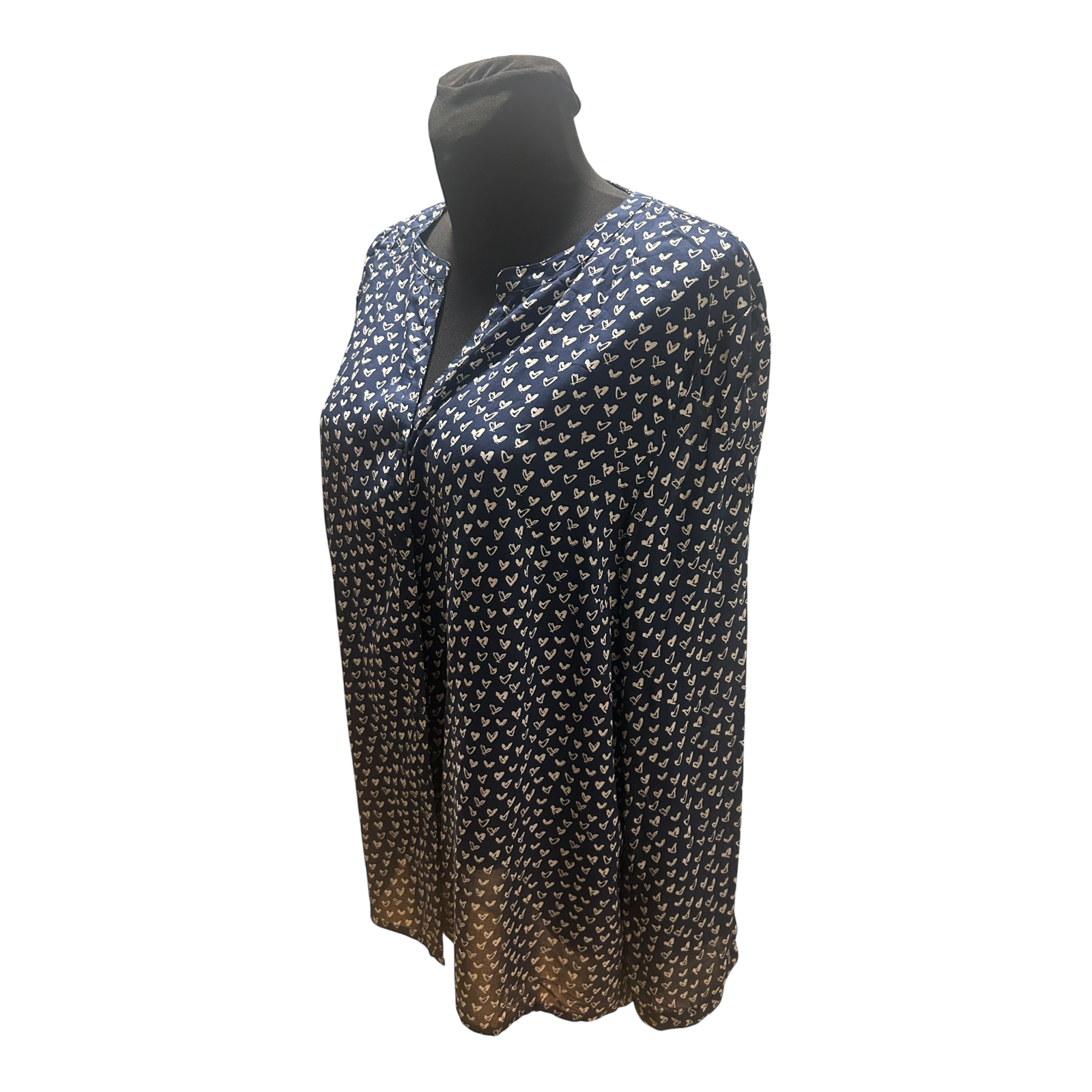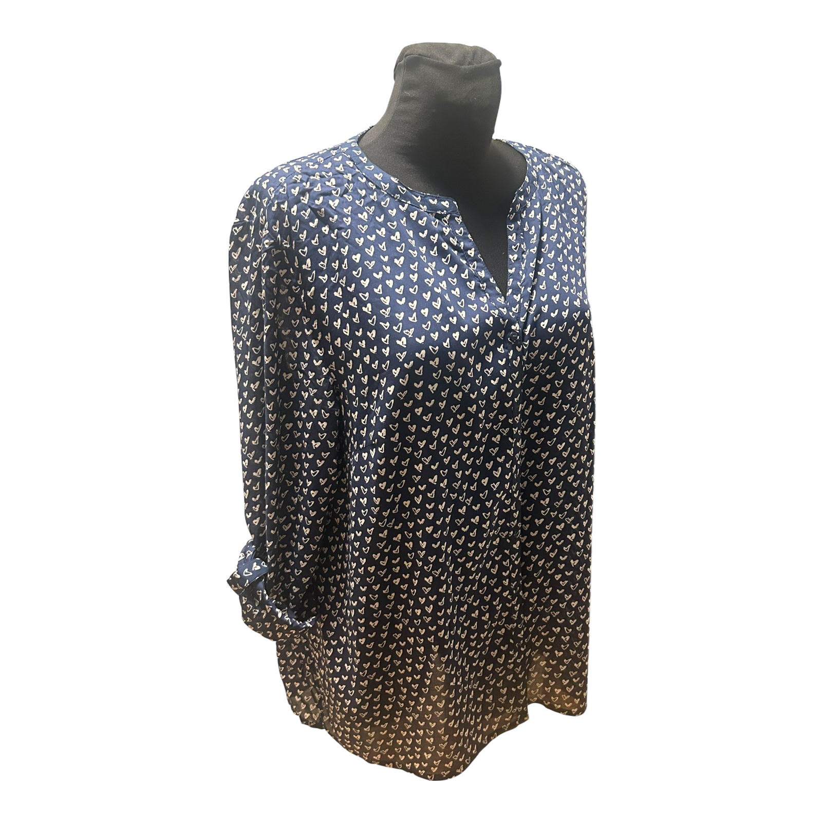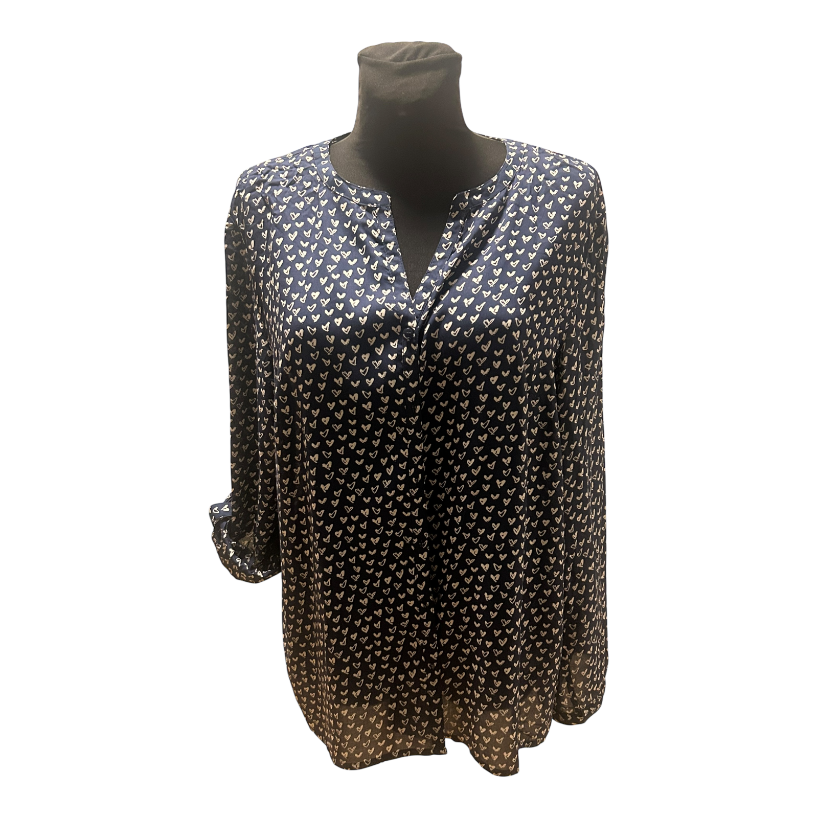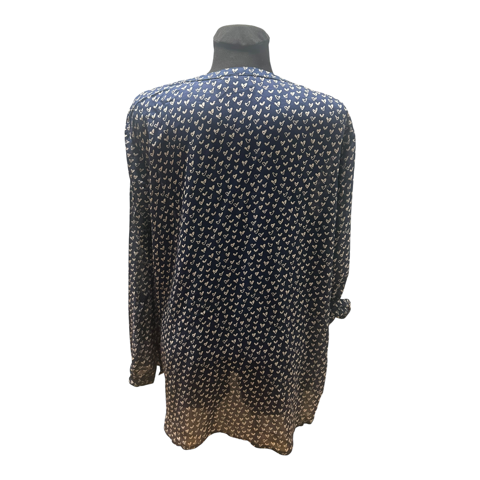 Wunderschöne dunkelblaue Bluse von Gina Benotti in Größe L mit vielen kleinen weißen Herzchen 🤍 Das feine Muster wirkt verspielt und gleichzeitig elegant und lässt sich wunderbar zu Jeans oder Stoffhose kombinieren.