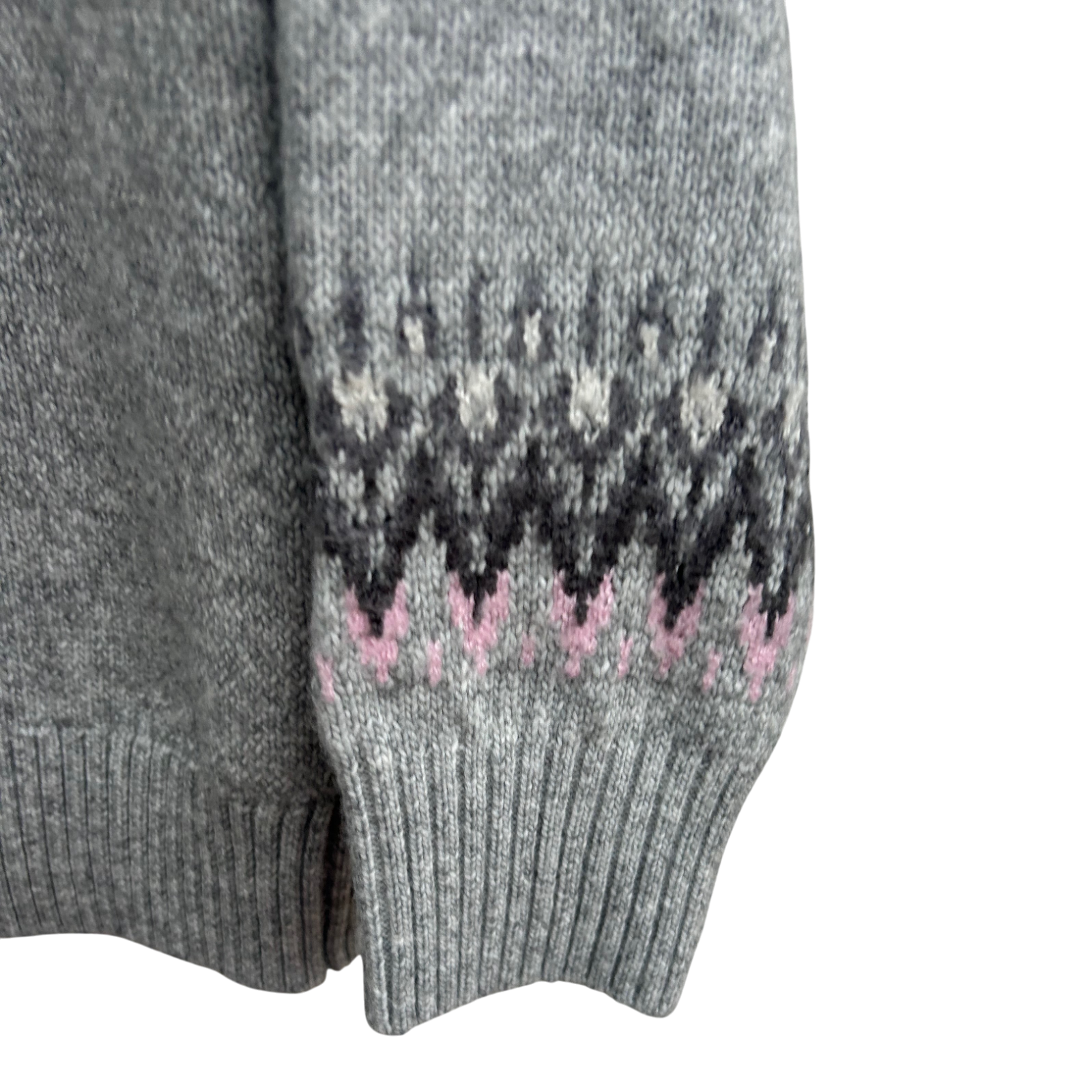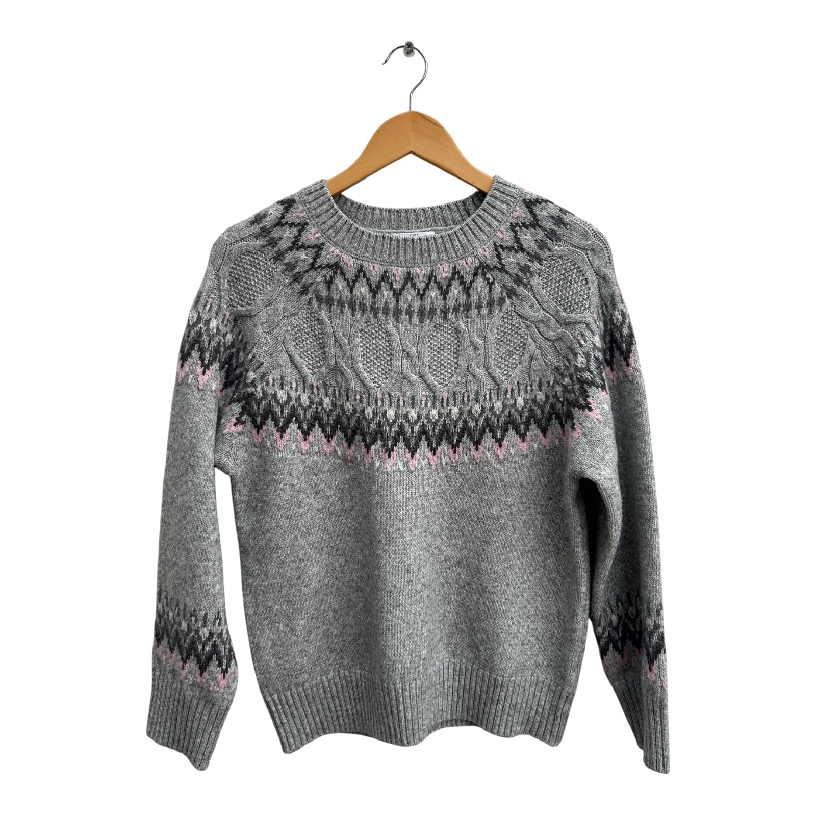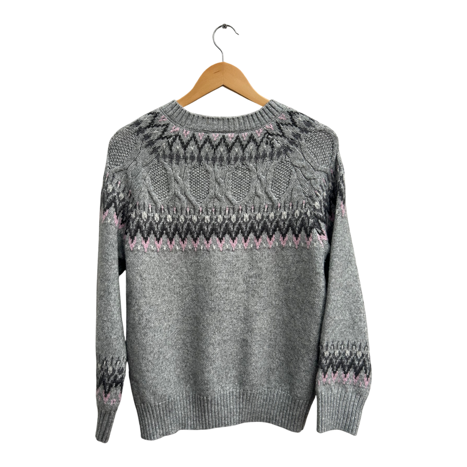 Weicher Strickpullover von Gina Benotti in Größe S. Das Modell zeigt ein schönes Norwegermuster in Grau, Schwarz und zartem Rosa und kombiniert klassischen Winterstil mit femininem Touch. Der Pullover ist angenehm zu tragen, pflegeleicht und formstabil.