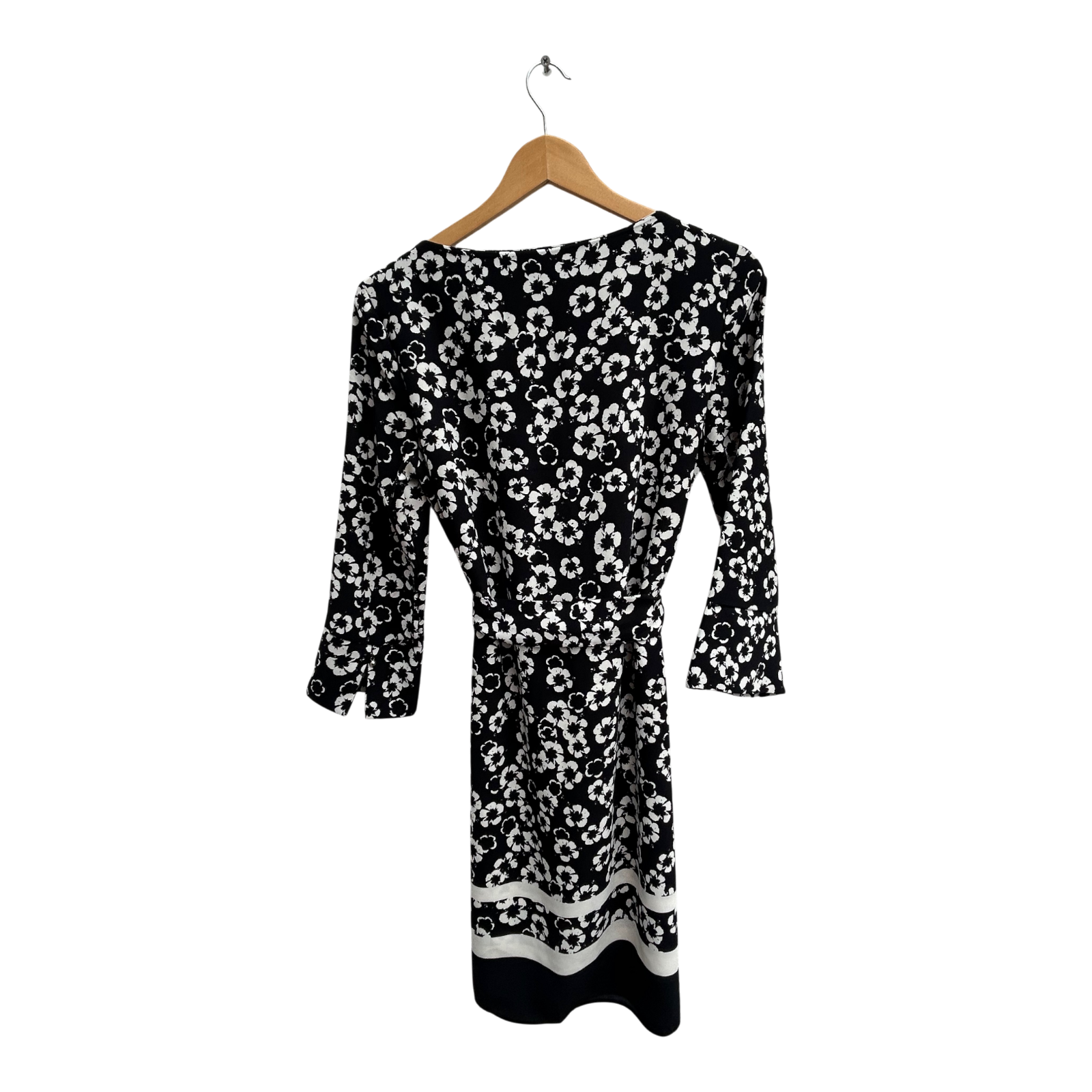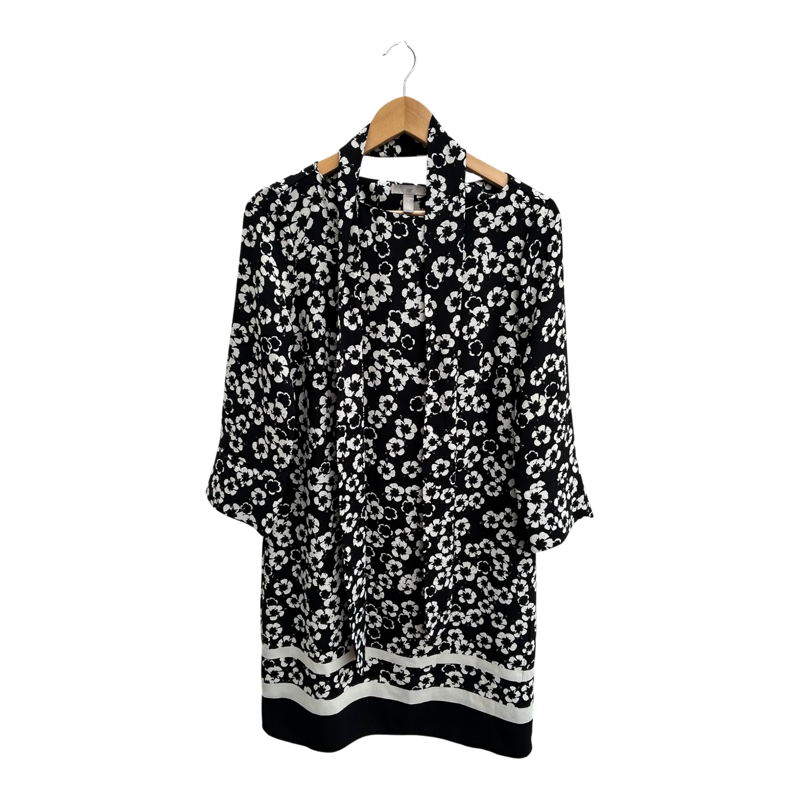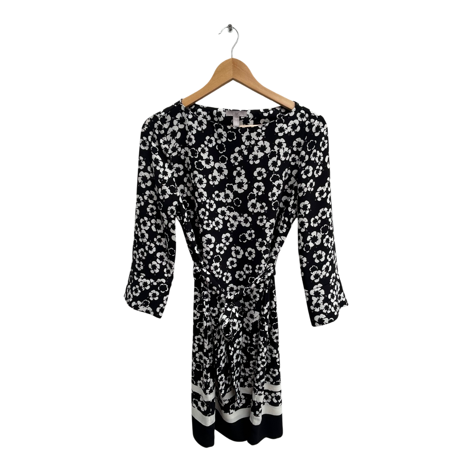 H&M Kleid Damen Gr 38 Schwarz Weiss Blumen Bindegürtel Elegant Klassisch Knielang