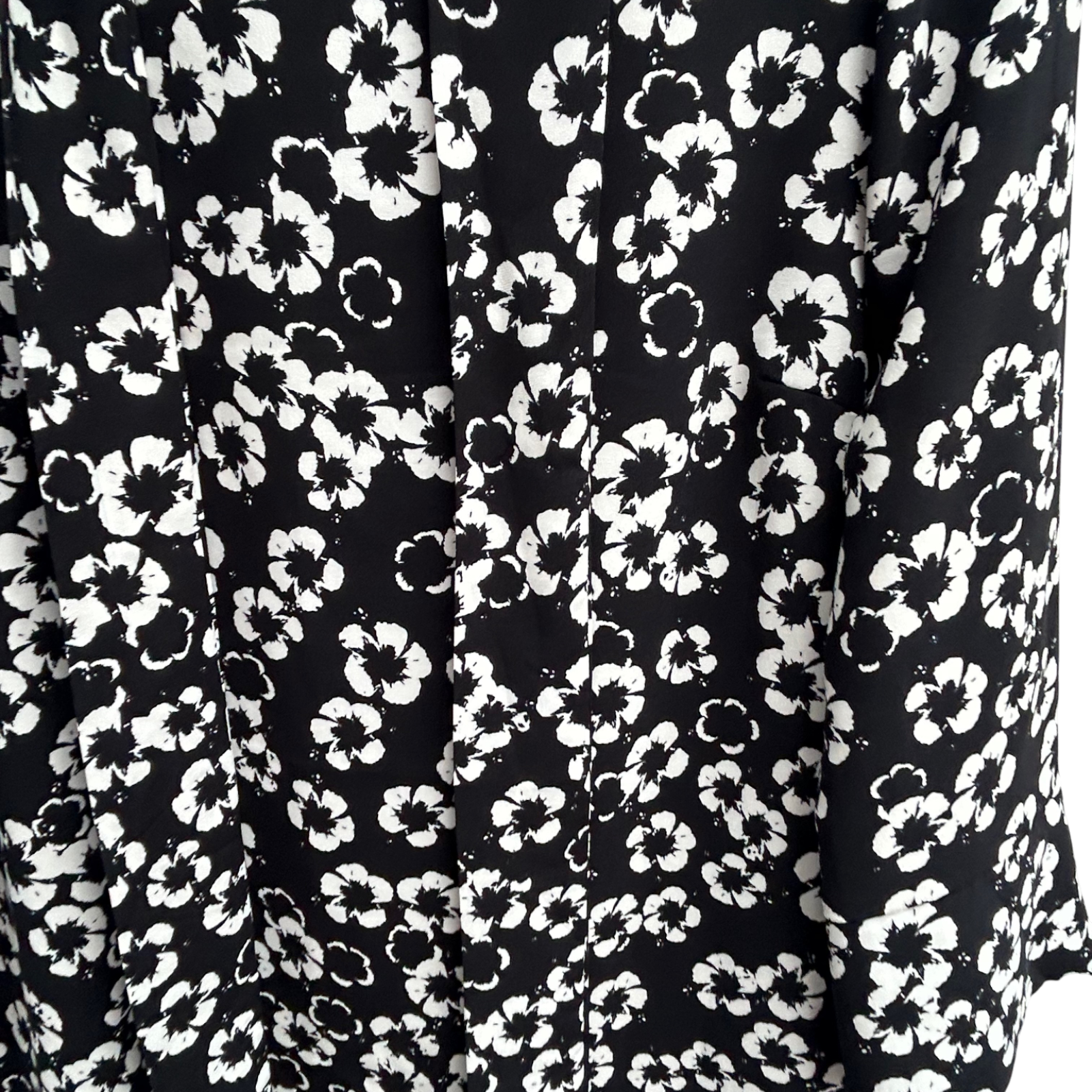 Ein feminines Kleid von H&M in Größe 38 aus 100% Polyester mit einem dekorativen Bindegürtel, der die Taille schön betont. Das Modell zeigt ein klares Schwarz Weiss Blumenmuster und besitzt dreiviertellange Ärmel mit einem eleganten kleinen Knopfdetail. Die Brustweite beträgt 47 cm, die Taille misst 47 cm und die Länge liegt bei 92 cm. Das Kleid fällt weich, ist pflegeleicht und ideal für Freizeit, Büro oder elegante Alltagslooks 🌸. Der Zustand ist sehr gut und das Material trägt sich angenehm leicht.
