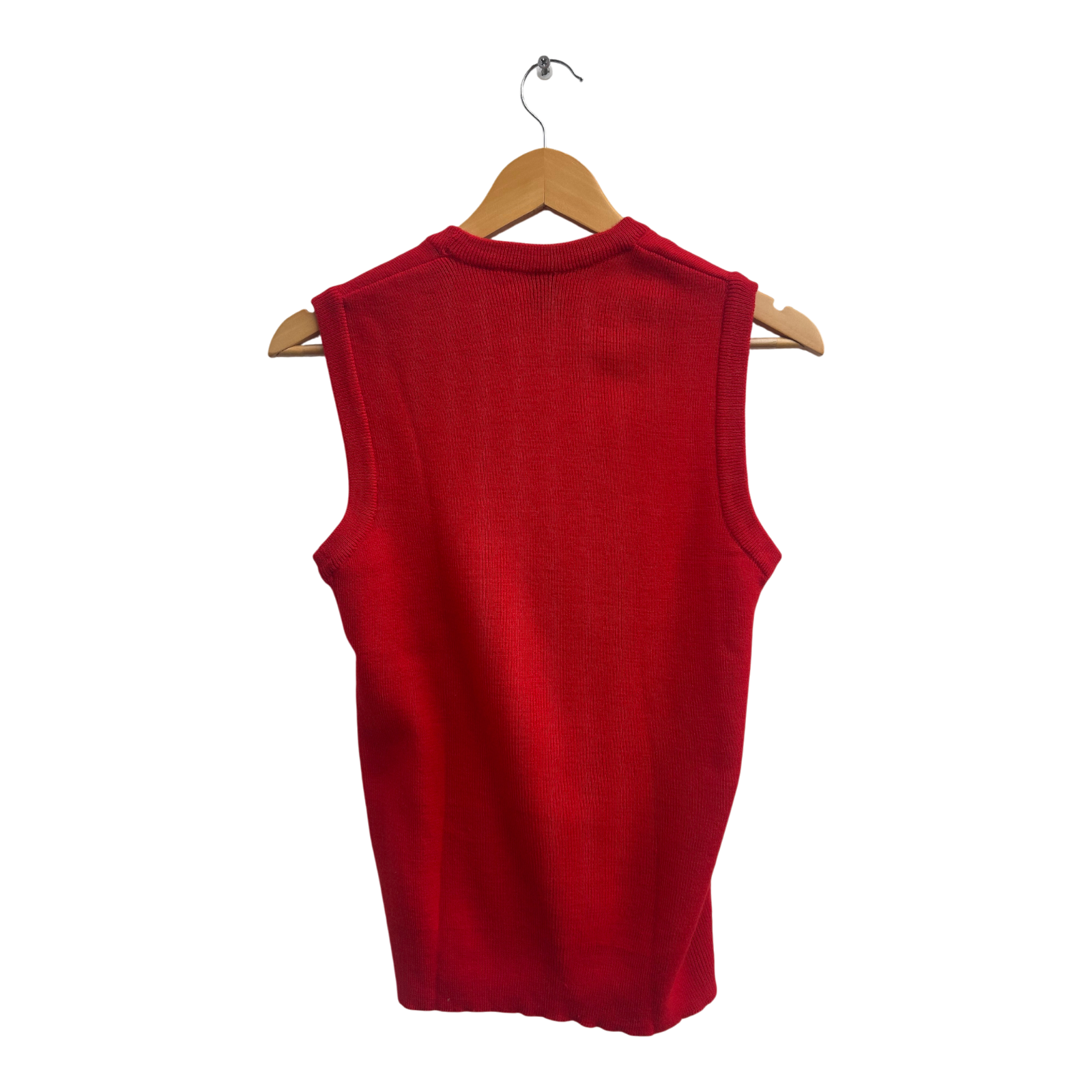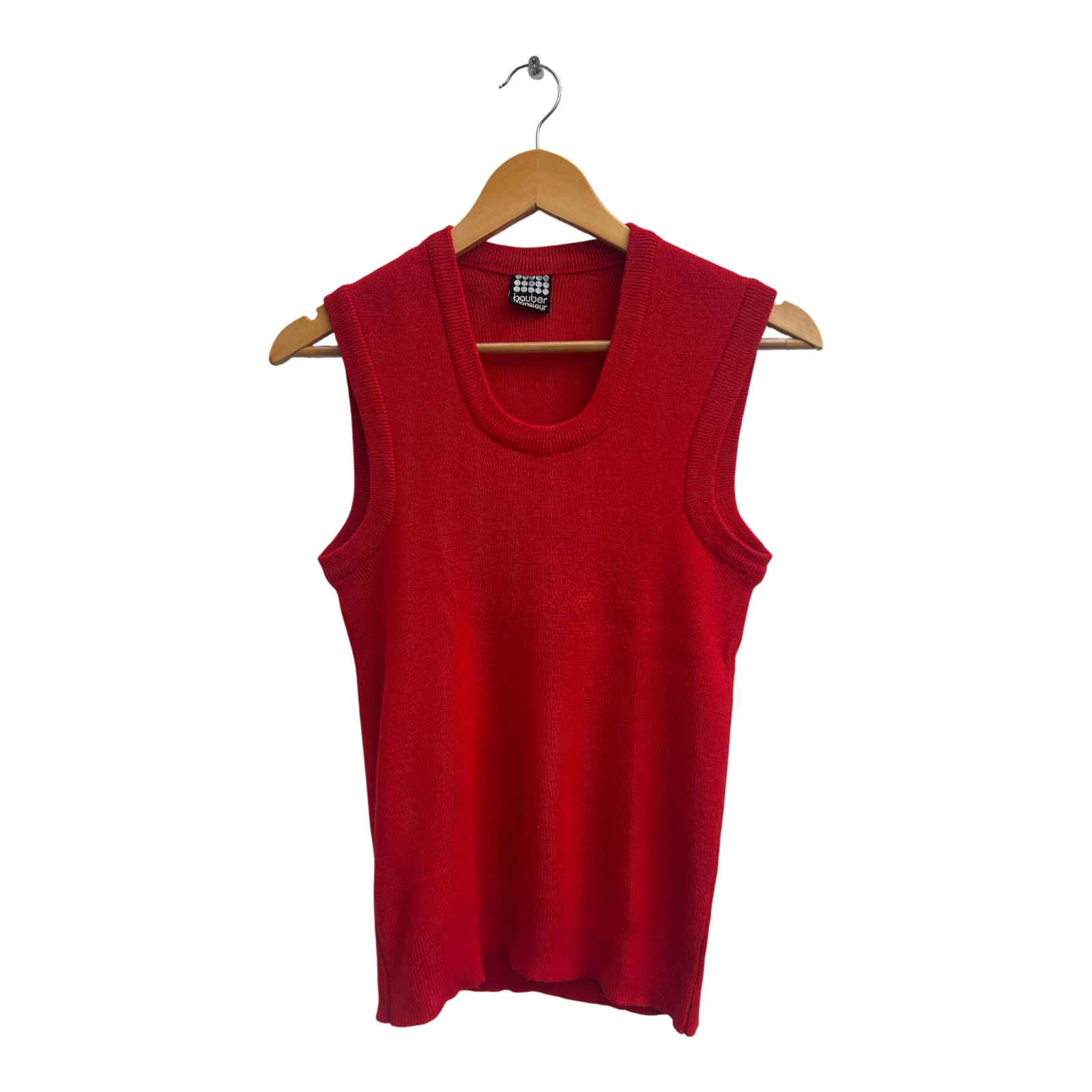 Seltenes Vintage-Modell von Hauber Monsieur in Größe S. Der leuchtend rote Pullunder aus feinem Strick ist ein klassisches Modell im Retro-Stil der 70er/80er-Jahre – schlicht, hochwertig und stilvoll.